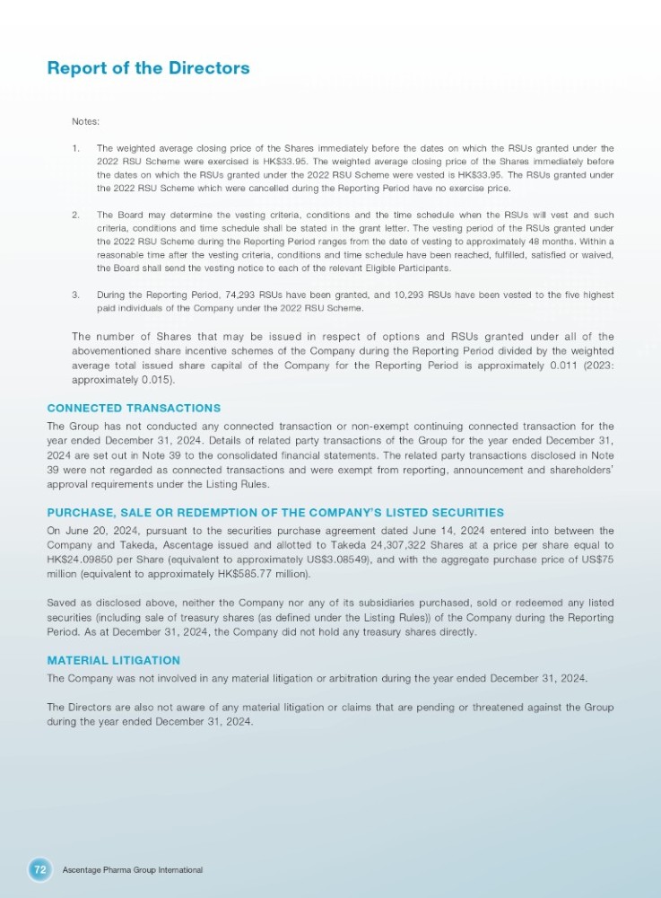 Ascentage Pharma Group International 72 Report of the Directors Notes: 1. The weighted average closing price of the Shares immediately before the dates on which the RSUs granted under the 2022 RSU Scheme were exercised is HK $ 33 . 95 . The weighted average closing price of the Shares immediately before the dates on which the RSUs granted under the 2022 RSU Scheme were vested is HK $ 33 . 95 . The RSUs granted under the 2022 RSU Scheme which were cancelled during the Reporting Period have no exercise price . 2. The Board may determine the vesting criteria, conditions and the time schedule when the RSUs will vest and such criteria, conditions and time schedule shall be stated in the grant letter . The vesting period of the RSUs granted under the 2022 RSU Scheme during the Reporting Period ranges from the date of vesting to approximately 48 months . Within a reasonable time after the vesting criteria, conditions and time schedule have been reached, fulfilled, satisfied or waived, the Board shall send the vesting notice to each of the relevant Eligible Participants . 3. During the Reporting Period, 74 , 293 RSUs have been granted, and 10 , 293 RSUs have been vested to the five highest paid individuals of the Company under the 2022 RSU Scheme . The number of Shares that may be issued in respect of options and RSUs granted under all of the abovementioned share incentive schemes of the Company during the Reporting Period divided by the weighted average total issued share capital of the Company for the Reporting Period is approximately 0 . 011 ( 2023 : approximately 0 . 015 ) . CONNECTED TRANSACTIONS The Group has not conducted any connected transaction or non - exempt continuing connected transaction for the year ended December 31 , 2024 . Details of related party transactions of the Group for the year ended December 31 , 2024 are set out in Note 39 to the consolidated financial statements . The related party transactions disclosed in Note 39 were not regarded as connected transactions and were exempt from reporting, announcement and shareholders ’ approval requirements under the Listing Rules . PURCHASE, SALE OR REDEMPTION OF THE COMPANY ’ S LISTED SECURITIES On June 20 , 2024 , pursuant to the securities purchase agreement dated June 14 , 2024 entered into between the Company and Takeda, Ascentage issued and allotted to Takeda 24 , 307 , 322 Shares at a price per share equal to HK $ 24 . 09850 per Share (equivalent to approximately US $ 3 . 08549 ), and with the aggregate purchase price of US $ 75 million (equivalent to approximately HK $ 585 . 77 million) . Saved as disclosed above, neither the Company nor any of its subsidiaries purchased, sold or redeemed any listed securities (including sale of treasury shares (as defined under the Listing Rules)) of the Company during the Reporting Period . As at December 31 , 2024 , the Company did not hold any treasury shares directly . MATERIAL LITIGATION The Company was not involved in any material litigation or arbitration during the year ended December 31 , 2024 . The Directors are also not aware of any material litigation or claims that are pending or threatened against the Group during the year ended December 31 , 2024 .