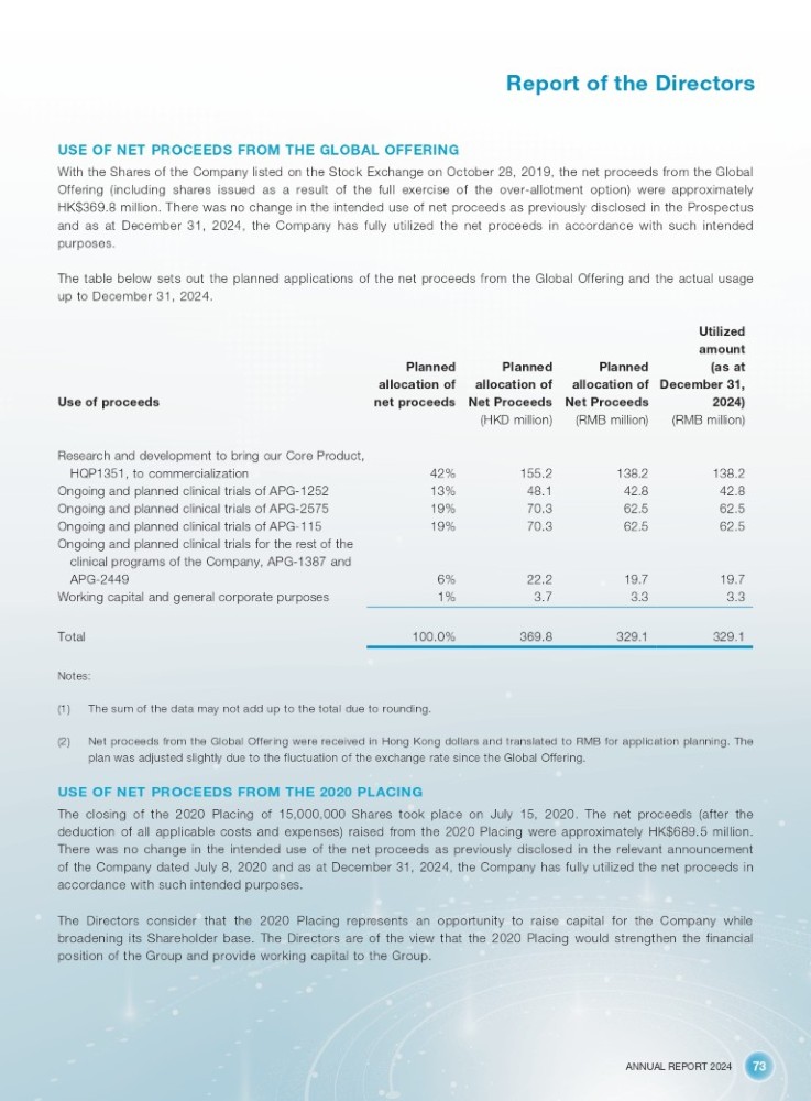ANNUAL REPORT 2024 73 Report of the Directors USE OF NET PROCEEDS FROM THE GLOBAL OFFERING With the Shares of the Company listed on the Stock Exchange on October 28 , 2019 , the net proceeds from the Global Offering (including shares issued as a result of the full exercise of the over - allotment option) were approximately HK $ 369 . 8 million . There was no change in the intended use of net proceeds as previously disclosed in the Prospectus and as at December 31 , 2024 , the Company has fully utilized the net proceeds in accordance with such intended purposes . The table below sets out the planned applications of the net proceeds from the Global Offering and the actual usage up to December 31 , 2024 . Utilized amount (as at December 31, 2024) Planned allocation of Net Proceeds Planned allocation of Net Proceeds Planned allocation of net proceeds Use of proceeds (RMB million) (RMB million) (HKD million) Research and development to bring our Core Product, 138.2 138.2 155.2 42% HQP1351, to commercialization 42.8 42.8 48.1 13% Ongoing and planned clinical trials of APG - 1252 62.5 62.5 70.3 19% Ongoing and planned clinical trials of APG - 2575 62.5 62.5 70.3 19% Ongoing and planned clinical trials of APG - 115 Ongoing and planned clinical trials for the rest of the clinical programs of the Company, APG - 1387 and 19.7 19.7 22.2 6% APG - 2449 3.3 3.3 3.7 1% Working capital and general corporate purposes 329.1 329.1 369.8 100.0% Total Notes: (1) The sum of the data may not add up to the total due to rounding. (2) Net proceeds from the Global Offering were received in Hong Kong dollars and translated to RMB for application planning. The plan was adjusted slightly due to the fluctuation of the exchange rate since the Global Offering. USE OF NET PROCEEDS FROM THE 2020 PLACING The closing of the 2020 Placing of 15 , 000 , 000 Shares took place on July 15 , 2020 . The net proceeds (after the deduction of all applicable costs and expenses) raised from the 2020 Placing were approximately HK $ 689 . 5 million . There was no change in the intended use of the net proceeds as previously disclosed in the relevant announcement of the Company dated July 8 , 2020 and as at December 31 , 2024 , the Company has fully utilized the net proceeds in accordance with such intended purposes . The Directors consider that the 2020 Placing represents an opportunity to raise capital for the Company while broadening its Shareholder base . The Directors are of the view that the 2020 Placing would strengthen the financial position of the Group and provide working capital to the Group .