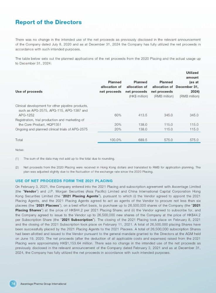 Ascentage Pharma Group International 74 Report of the Directors There was no change in the intended use of the net proceeds as previously disclosed in the relevant announcement of the Company dated July 8 , 2020 and as at December 31 , 2024 the Company has fully utilized the net proceeds in accordance with such intended purposes . The table below sets out the planned applications of the net proceeds from the 2020 Placing and the actual usage up to December 31 , 2024 : Use of proceeds Planned allocation of net proceeds Planned allocation of net proceeds (HK$ million) Planned allocation of net proceeds (RMB million) Utilized amount (as at December 31, 2024) (RMB million) Clinical development for other pipeline products, such as APG - 2575, APG - 115, APG - 1387 and 345.0 345.0 413.5 60% APG - 1252 Registration, trial production and marketing of 115.0 115.0 138.0 20% the Core Product, HQP1351 115.0 115.0 138.0 20% Ongoing and planned clinical trials of APG - 2575 575.0 575.0 689.5 100.0% Total Notes: (1) The sum of the data may not add up to the total due to rounding. (2) Net proceeds from the 2020 Placing were received in Hong Kong dollars and translated to RMB for application planning. The plan was adjusted slightly due to the fluctuation of the exchange rate since the 2020 Placing. USE OF NET PROCEEDS FORM THE 2021 PLACING On February 3 , 2021 , the Company entered into the 2021 Placing and subscription agreement with Ascentage Limited (the “ Vendor ” ) and J . P . Morgan Securities (Asia Pacific) Limited and China International Capital Corporation Hong Kong Securities Limited (the “ 2021 Placing Agents ” ), pursuant to which (i) the Vendor agreed to appoint the 2021 Placing Agents, and the 2021 Placing Agents agreed to act as agents of the Vendor to procure not less than six placees (the “ 2021 Placees ” ), on a best effort basis, to purchase up to 26 , 500 , 000 shares of the Company (the “ 2021 Placing Shares ” ) at the price of HK $ 44 . 2 per 2021 Placing Share ; and (ii) the Vendor agreed to subscribe for, and the Company agreed to issue to the Vendor up to 26 , 500 , 000 new shares of the Company at the price of HK $ 44 . 2 per Subscription Share (the “ 2021 Subscription ” ) . The closing of the 2021 Placing took place on February 8 , 2021 and the closing of the 2021 Subscription took place on February 11 , 2021 . A total of 26 , 500 , 000 placing Shares have been successfully placed by the 2021 Placing Agents to the 2021 Placees . A total of 26 , 500 , 000 subscription Shares had been allotted and issued to the Vendor pursuant to the general mandate granted to the Directors at the AGM held on June 19 , 2020 . The net proceeds (after the deduction of all applicable costs and expenses) raised from the 2021 Placing were approximately HK $ 1 , 153 . 64 million . There was no change in the intended use of the net proceeds as previously disclosed in the relevant announcement of the Company dated February 3 , 2021 and as at December 31 , 2024 , the Company has fully utilized the net proceeds in accordance with such intended purposes .