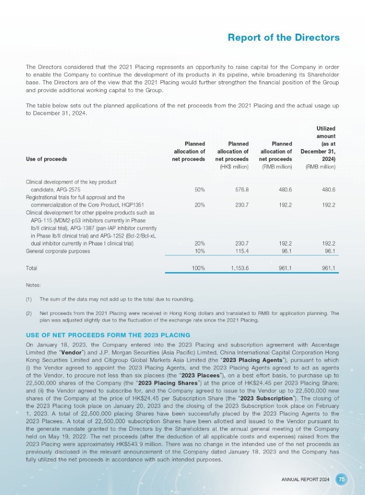 ANNUAL REPORT 2024 75 Report of the Directors The Directors considered that the 2021 Placing represents an opportunity to raise capital for the Company in order to enable the Company to continue the development of its products in its pipeline, while broadening its Shareholder base . The Directors are of the view that the 2021 Placing would further strengthen the financial position of the Group and provide additional working capital to the Group . The table below sets out the planned applications of the net proceeds from the 2021 Placing and the actual usage up to December 31 , 2024 . Use of proceeds Planned allocation of net proceeds Planned allocation of net proceeds (HK$ million) Planned allocation of net proceeds (RMB million) Utilized amount (as at December 31, 2024) (RMB million) Clinical development of the key product 480.6 480.6 576.8 50% candidate, APG - 2575 Registrational trials for full approval and the 192.2 192.2 230.7 20% commercialization of the Core Product, HQP1351 192.2 192.2 230.7 20% 96.1 96.1 115.4 10% 961.1 961.1 1,153.6 100% Clinical development for other pipeline products such as APG - 115 (MDM 2 - p 53 inhibitors currently in Phase lb/II clinical trial), APG - 1387 (pan - IAP inhibitor currently in Phase lb/II clinical trial) and APG - 1252 (Bcl - 2 /Bcl - xL dual inhibitor currently in Phase I clinical trial) General corporate purposes Total Notes: (1) The sum of the data may not add up to the total due to rounding . (2) Net proceeds from the 2021 Placing were received in Hong Kong dollars and translated to RMB for application planning. The plan was adjusted slightly due to the fluctuation of the exchange rate since the 2021 Placing. USE OF NET PROCEEDS FORM THE 2023 PLACING On January 18 , 2023 , the Company entered into the 2023 Placing and subscription agreement with Ascentage Limited (the “ Vendor ” ) and J . P . Morgan Securities (Asia Pacific) Limited, China International Capital Corporation Hong Kong Securities Limited and Citigroup Global Markets Asia Limited (the “ 2023 Placing Agents ” ), pursuant to which (i) the Vendor agreed to appoint the 2023 Placing Agents, and the 2023 Placing Agents agreed to act as agents of the Vendor, to procure not less than six placees (the “ 2023 Placees ” ), on a best effort basis, to purchase up to 22 , 500 , 000 shares of the Company (the “ 2023 Placing Shares ” ) at the price of HK $ 24 . 45 per 2023 Placing Share ; and (ii) the Vendor agreed to subscribe for, and the Company agreed to issue to the Vendor up to 22 , 500 , 000 new shares of the Company at the price of HK $ 24 . 45 per Subscription Share (the “ 2023 Subscription ” ) . The closing of the 2023 Placing took place on January 20 , 2023 and the closing of the 2023 Subscription took place on February 1 , 2023 . A total of 22 , 500 , 000 placing Shares have been successfully placed by the 2023 Placing Agents to the 2023 Placees . A total of 22 , 500 , 000 subscription Shares have been allotted and issued to the Vendor pursuant to the generate mandate granted to the Directors by the Shareholders at the annual general meeting of the Company held on May 19 , 2022 . The net proceeds (after the deduction of all applicable costs and expenses) raised from the 2023 Placing were approximately HK $ 543 . 9 million . There was no change in the intended use of the net proceeds as previously disclosed in the relevant announcement of the Company dated January 18 , 2023 and the Company has fully utilized the net proceeds in accordance with such intended purposes .