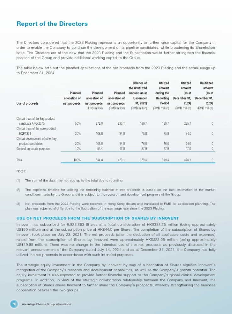 Ascentage Pharma Group International 76 Report of the Directors The Directors considered that the 2023 Placing represents an opportunity to further raise capital for the Company in order to enable the Company to continue the development of its pipeline candidates, while broadening its Shareholder base . The Directors are of the view that the 2023 Placing and the Subscription would further strengthen the financial position of the Group and provide additional working capital to the Group . The table below sets out the planned applications of the net proceeds from the 2023 Placing and the actual usage up to December 31 , 2024 . Use of proceeds Planned allocation of net proceeds Planned allocation of net proceeds (HK$ million) Planned allocation of net proceeds (RMB million) Balance of the unutilized amount (as at December 31, 2023) (RMB million) Utilized amount during the Reporting Period (RMB million) Utilized amount (as at December 31, 2024) (RMB million) Unutilized amount (as at December 31, 2024) (RMB million) Clinical trials of the key product 0 235.1 189.7 189.7 235.1 272.0 50% candidate APG - 2575 Clinical trials of the core product 0 94.0 75.8 75.8 94.0 108.8 20% HQP1351 Clinical development of other key 0 94.0 76.0 76.0 94.0 108.8 20% product candidates 0 47.0 37.9 37.9 47.0 54.4 10% General corporate purposes 0 470.1 379.4 379.4 470.1 544.0 100% Total Notes: (1) The sum of the data may not add up to the total due to rounding. (2) The expected timeline for utilizing the remaining balance of net proceeds is based on the best estimation of the market conditions made by the Group and it is subject to the research and development progress of the Group. (3) Net proceeds from the 2023 Placing were received in Hong Kong dollars and translated to RMB for application planning. The plan was adjusted slightly due to the fluctuation of the exchange rate since the 2023 Placing. USE OF NET PROCEEDS FROM THE SUBSCRIPTION OF SHARES BY INNOVENT Innovent has subscribed for 8 , 823 , 863 Shares at a total consideration of HK $ 388 . 25 million (being approximately US $ 50 million) and at the subscription price of HK $ 44 . 0 per Share . The completion of the subscription of Shares by Innovent took place on July 23 , 2021 . The net proceeds (after the deduction of all applicable costs and expenses) raised from the subscription of Shares by Innovent were approximately HK $ 388 . 06 million (being approximately US $ 49 . 98 million) . There was no change in the intended use of the net proceeds as previously disclosed in the relevant announcement of the Company dated July 14 , 2021 and as at December 31 , 2024 , the Company has fully utilized the net proceeds in accordance with such intended purposes . The strategic equity investment in the Company by Innovent by way of subscription of Shares signifies Innovent ’ s recognition of the Company ’ s research and development capabilities, as well as the Company ’ s growth potential . The equity investment is also expected to provide further financial support to the Company ’ s global clinical development programs . In addition, in view of the strategic collaboration relationship between the Company and Innovent, the subscription of Shares allows Innovent to further share the Company ’ s prospects, whereby strengthening the business cooperation between the two groups .