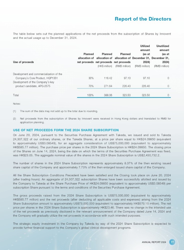 ANNUAL REPORT 2024 77 Report of the Directors The table below sets out the planned applications of the net proceeds from the subscription of Shares by Innovent and the actual usage up to December 31, 2024. Unutilized Utilized amount amount (as at (as at Planned Planned Planned December 31, December 31, allocation of allocation of allocation of 2024) (RMB million) 2024) (RMB million) net proceeds (RMB million) net proceeds (HK$ million) net proceeds 0 97.10 97.10 116.42 30% 0 226.40 226.40 271.64 70% 0 323.50 323.50 388.06 100% Use of proceeds Development and commercialization of the Company ’ s Core Product, HQP1351 Development of the Company ’ s key product candidate, APG - 2575 Total Notes: (1) The sum of the data may not add up to the total due to rounding. (2) Net proceeds from the subscription of Shares by Innovent were received in Hong Kong dollars and translated to RMB for application planning. USE OF NET PROCEEDS FORM THE 2024 SHARE SUBSCRIPTION On June 20 , 2024 , pursuant to the Securities Purchase Agreement with Takeda, we issued and sold to Takeda 24 , 307 , 322 of our ordinary shares, or the Takeda Shares, at a price per share equal to HK $ 24 . 09850 (equivalent to approximately US $ 3 . 08549 ), for an aggregate consideration of US $ 75 , 000 , 000 (equivalent to approximately HK $ 585 . 77 million) . The purchase price per shares in the 2024 Share Subscription is HK $ 24 . 09850 . The closing price of the Shares on June 14 , 2024 , being the date on which the terms of the Securities Purchase Agreement was fixed, was HK $ 23 . 05 . The aggregate nominal value of the shares in the 2024 Share Subscription is US $ 2 , 430 , 732 . 2 . The number of shares in the 2024 Share Subscription represents approximately 8 . 37 % of the then existing issued share capital of the Company and approximately 7 . 73 % of the then enlarged issued share capital of the Company . All the Share Subscription Conditions Precedent have been satisfied and the Closing took place on June 20 , 2024 (after trading hours) . An aggregate of 24 , 307 , 322 subscription Shares have been successfully allotted and issued by the Company to Takeda at the Share Purchase Price of HK $ 24 . 09850 (equivalent to approximately US $ 3 . 08549 ) per subscription Share pursuant to the terms and conditions of the Securities Purchase Agreement . The gross proceeds raised from the 2024 Share Subscription is US $ 75 , 000 , 000 (equivalent to approximately HK $ 585 . 77 million) and the net proceeds (after deducting all applicable costs and expenses) arising from the 2024 Share Subscription amount to approximately US $ 73 , 000 , 000 (equivalent to approximately HK $ 570 . 15 million) . The net price per shares in the 2024 Share Subscription is approximately HK $ 23 . 46 . There was no change in the intended use of the net proceeds as previously disclosed in the relevant announcement of the Company dated June 14 , 2024 and the Company will gradually utilize the net proceeds in accordance with such intended purposes . The strategic equity investment in the Company by Takeda by way of the 2024 Share Subscription is expected to provide further financial support to the Company ’ s global clinical development programs .