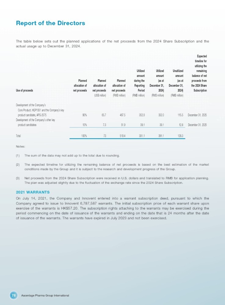 Ascentage Pharma Group International 78 Report of the Directors The table below sets out the planned applications of the net proceeds from the 2024 Share Subscription and the actual usage up to December 31, 2024. Expected timeline for utilizing the remaining balance of net proceeds from Unutilized amount (as at Utilized amount (as at Utilized amount during the Planned Planned Planned the 2024 Share December 31, December 31, Reporting allocation of allocation of allocation of Subscription 2024) (RMB million) 2024) (RMB million) Period (RMB million) net proceeds (RMB million) net proceeds (US$ million) net proceeds Use of proceeds Development of the Company ’ s Core Product, HQP1351 and the Company ’ s key December 31, 2025 115.5 352.0 352.0 467.5 65.7 90% product candidate, APG - 2575 Development of the Company ’ s other key December 31, 2025 12.8 39.1 39.1 51.9 7.3 10% product candidates 128.3 391.1 391.1 519.4 73 100% Total Notes: (1) The sum of the data may not add up to the total due to rounding. (2) The expected timeline for utilizing the remaining balance of net proceeds is based on the best estimation of the market conditions made by the Group and it is subject to the research and development progress of the Group. (3) Net proceeds from the 2024 Share Subscription were received in U.S. dollars and translated to RMB for application planning. The plan was adjusted slightly due to the fluctuation of the exchange rate since the 2024 Share Subscription. 2021 WARRANTS On July 14 , 2021 , the Company and Innovent entered into a warrant subscription deed, pursuant to which the Company agreed to issue to Innovent 6 , 787 , 587 warrants . The initial subscription price of each warrant share upon exercise of the warrants is HK $ 57 . 20 . The subscription rights attaching to the warrants may be exercised during the period commencing on the date of issuance of the warrants and ending on the date that is 24 months after the date of issuance of the warrants . The warrants have expired in July 2023 and not been exercised .