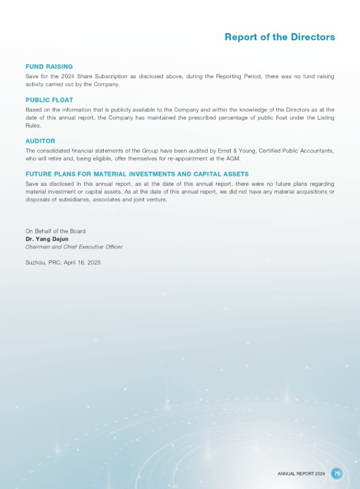 ANNUAL REPORT 2024 79 Report of the Directors FUND RAISING Save for the 2024 Share Subscription as disclosed above, during the Reporting Period, there was no fund raising activity carried out by the Company . PUBLIC FLOAT Based on the information that is publicly available to the Company and within the knowledge of the Directors as at the date of this annual report, the Company has maintained the prescribed percentage of public float under the Listing Rules . AUDITOR The consolidated financial statements of the Group have been audited by Ernst & Young, Certified Public Accountants, who will retire and, being eligible, offer themselves for re - appointment at the AGM . FUTURE PLANS FOR MATERIAL INVESTMENTS AND CAPITAL ASSETS Save as disclosed in this annual report, as at the date of this annual report, there were no future plans regarding material investment or capital assets . As at the date of this annual report, we did not have any material acquisitions or disposals of subsidiaries, associates and joint venture . On Behalf of the Board Dr. Yang Dajun Chairman and Chief Executive Officer Suzhou, PRC, April 16, 2025