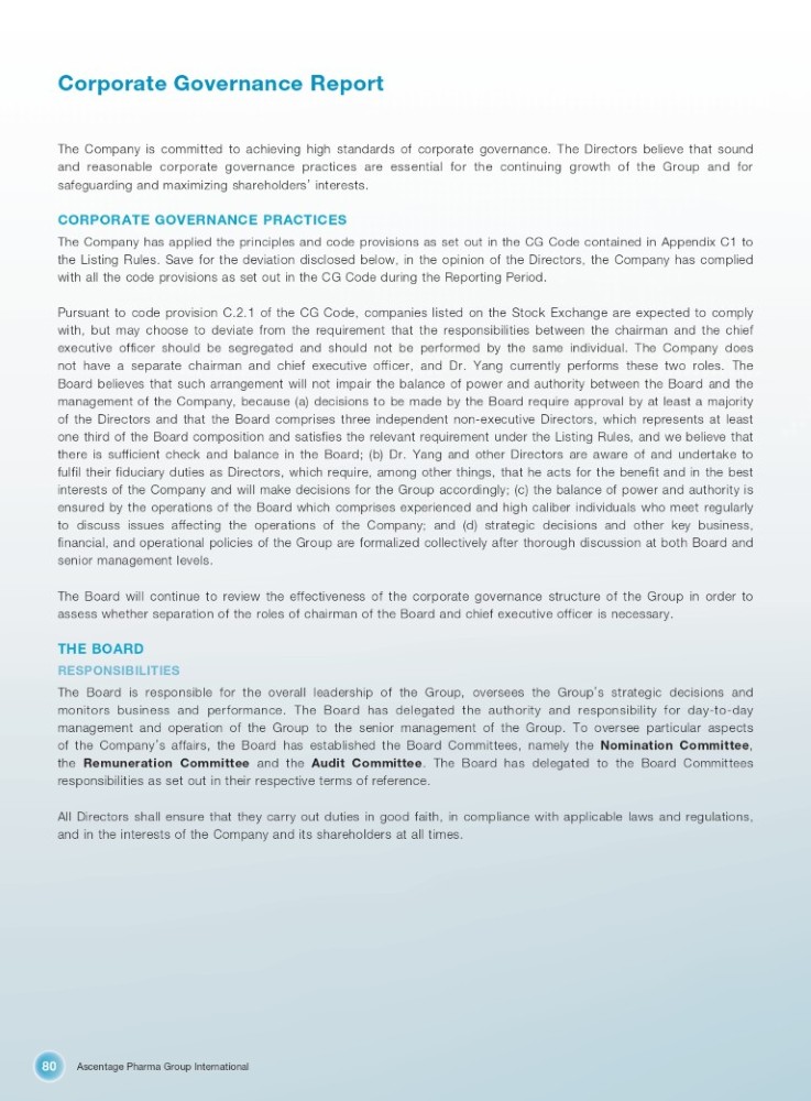 Ascentage Pharma Group International 80 Corporate Governance Report The Company is committed to achieving high standards of corporate governance . The Directors believe that sound and reasonable corporate governance practices are essential for the continuing growth of the Group and for safeguarding and maximizing shareholders ’ interests . CORPORATE GOVERNANCE PRACTICES The Company has applied the principles and code provisions as set out in the CG Code contained in Appendix C 1 to the Listing Rules . Save for the deviation disclosed below, in the opinion of the Directors, the Company has complied with all the code provisions as set out in the CG Code during the Reporting Period . Pursuant to code provision C . 2 . 1 of the CG Code, companies listed on the Stock Exchange are expected to comply with, but may choose to deviate from the requirement that the responsibilities between the chairman and the chief executive officer should be segregated and should not be performed by the same individual . The Company does not have a separate chairman and chief executive officer, and Dr . Yang currently performs these two roles . The Board believes that such arrangement will not impair the balance of power and authority between the Board and the management of the Company, because (a) decisions to be made by the Board require approval by at least a majority of the Directors and that the Board comprises three independent non - executive Directors, which represents at least one third of the Board composition and satisfies the relevant requirement under the Listing Rules, and we believe that there is sufficient check and balance in the Board ; (b) Dr . Yang and other Directors are aware of and undertake to fulfil their fiduciary duties as Directors, which require, among other things, that he acts for the benefit and in the best interests of the Company and will make decisions for the Group accordingly ; (c) the balance of power and authority is ensured by the operations of the Board which comprises experienced and high caliber individuals who meet regularly to discuss issues affecting the operations of the Company ; and (d) strategic decisions and other key business, financial, and operational policies of the Group are formalized collectively after thorough discussion at both Board and senior management levels . The Board will continue to review the effectiveness of the corporate governance structure of the Group in order to assess whether separation of the roles of chairman of the Board and chief executive officer is necessary . THE BOARD RESPONSIBILITIES The Board is responsible for the overall leadership of the Group, oversees the Group ’ s strategic decisions and monitors business and performance . The Board has delegated the authority and responsibility for day - to - day management and operation of the Group to the senior management of the Group . To oversee particular aspects of the Company ’ s affairs, the Board has established the Board Committees, namely the Nomination Committee , the Remuneration Committee and the Audit Committee . The Board has delegated to the Board Committees responsibilities as set out in their respective terms of reference . All Directors shall ensure that they carry out duties in good faith, in compliance with applicable laws and regulations, and in the interests of the Company and its shareholders at all times .
