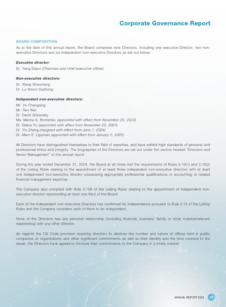 ANNUAL REPORT 2024 81 Corporate Governance Report BOARD COMPOSITION As at the date of this annual report, the Board comprises nine Directors, including one executive Director, two non - executive Directors and six independent non - executive Directors as set out below: Executive director: Dr. Yang Dajun (Chairman and chief executive officer) Non - executive directors: Dr. Wang Shaomeng Dr. Lu Simon Dazhong Independent non - executive directors: Mr. Ye Changqing Mr. Ren Wei Dr . David Sidransky Ms. Marina S. Bozilenko (appointed with effect from November 25, 2024) Dr. Debra Yu (appointed with effect from November 25, 2024) Dr. Yin Zheng (resigned with effect from June 7, 2024) Dr. Marc E. Lippman (appointed with effect from January 2, 2025) All Directors have distinguished themselves in their field of expertise, and have exhibit high standards of personal and professional ethics and integrity . The biographies of the Directors are set out under the section headed “ Directors and Senior Management ” of this annual report . During the year ended December 31 , 2024 , the Board at all times met the requirements of Rules 3 . 10 ( 1 ) and 3 . 10 ( 2 ) of the Listing Rules relating to the appointment of at least three independent non - executive directors with at least one independent non - executive director possessing appropriate professional qualifications or accounting or related financial management expertise . The Company also complied with Rule 3 . 10 A of the Listing Rules relating to the appointment of independent non - executive director representing at least one - third of the Board . Each of the independent non - executive Directors has confirmed his independence pursuant to Rule 3 . 13 of the Listing Rules and the Company considers each of them to be independent . None of the Directors has any personal relationship (including financial, business, family or other material/relevant relationship) with any other Director . As regards the CG Code provision requiring directors to disclose the number and nature of offices held in public companies or organizations and other significant commitments as well as their identity and the time involved to the issuer, the Directors have agreed to disclose their commitments to the Company in a timely manner .