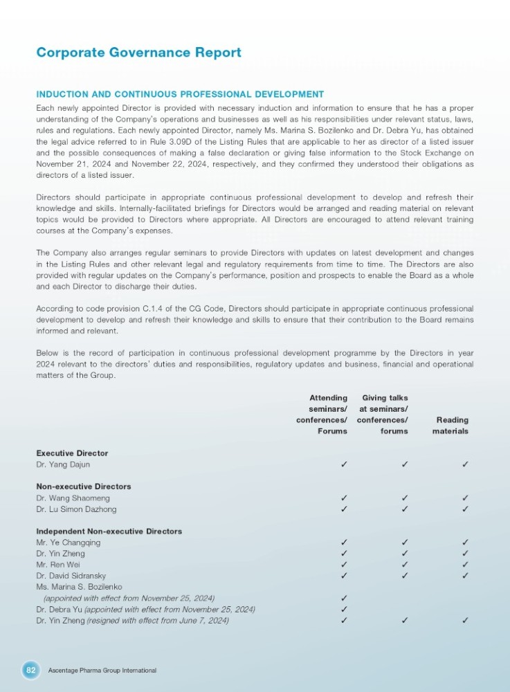 Ascentage Pharma Group International 82 Corporate Governance Report INDUCTION AND CONTINUOUS PROFESSIONAL DEVELOPMENT Each newly appointed Director is provided with necessary induction and information to ensure that he has a proper understanding of the Company ’ s operations and businesses as well as his responsibilities under relevant status, laws, rules and regulations . Each newly appointed Director, namely Ms . Marina S . Bozilenko and Dr . Debra Yu, has obtained the legal advice referred to in Rule 3 . 09 D of the Listing Rules that are applicable to her as director of a listed issuer and the possible consequences of making a false declaration or giving false information to the Stock Exchange on November 21 , 2024 and November 22 , 2024 , respectively, and they confirmed they understood their obligations as directors of a listed issuer . Directors should participate in appropriate continuous professional development to develop and refresh their knowledge and skills . Internally - facilitated briefings for Directors would be arranged and reading material on relevant topics would be provided to Directors where appropriate . All Directors are encouraged to attend relevant training courses at the Company ’ s expenses . The Company also arranges regular seminars to provide Directors with updates on latest development and changes in the Listing Rules and other relevant legal and regulatory requirements from time to time . The Directors are also provided with regular updates on the Company ’ s performance, position and prospects to enable the Board as a whole and each Director to discharge their duties . According to code provision C . 1 . 4 of the CG Code, Directors should participate in appropriate continuous professional development to develop and refresh their knowledge and skills to ensure that their contribution to the Board remains informed and relevant . Below is the record of participation in continuous professional development programme by the Directors in year 2024 relevant to the directors ’ duties and responsibilities, regulatory updates and business, financial and operational matters of the Group . Reading materials Giving talks at seminars/ conferences/ forums Attending seminars/ conferences/ Forums Executive Director 㾐 㾐 㾐 Dr. Yang Dajun Non - executive Directors 㾐 㾐 㾐 Dr. Wang Shaomeng 㾐 㾐 㾐 Dr. Lu Simon Dazhong Independent Non - executive Directors 㾐 㾐 㾐 Mr. Ye Changqing 㾐 㾐 㾐 Dr. Yin Zheng 㾐 㾐 㾐 Mr. Ren Wei 㾐 㾐 㾐 Dr. David Sidransky 㾐 Ms. Marina S. Bozilenko (appointed with effect from November 25, 2024) 㾐 㾐 㾐 㾐 Dr. Debra Yu (appointed with effect from November 25, 2024) Dr. Yin Zheng (resigned with effect from June 7, 2024)