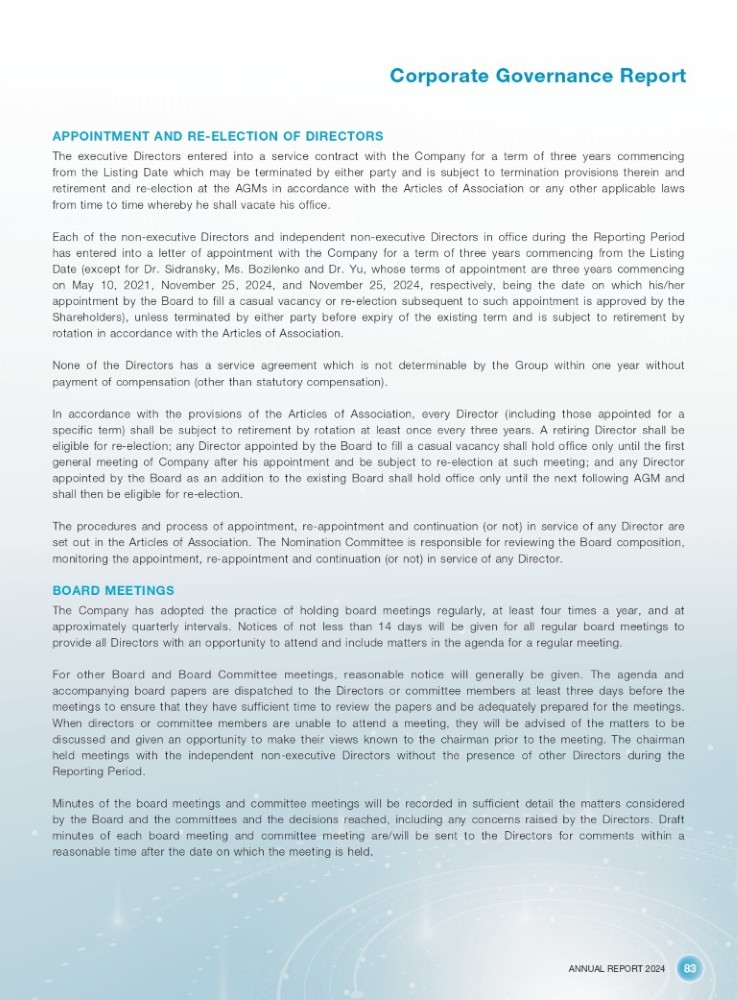 ANNUAL REPORT 2024 83 Corporate Governance Report APPOINTMENT AND RE - ELECTION OF DIRECTORS The executive Directors entered into a service contract with the Company for a term of three years commencing from the Listing Date which may be terminated by either party and is subject to termination provisions therein and retirement and re - election at the AGMs in accordance with the Articles of Association or any other applicable laws from time to time whereby he shall vacate his office . Each of the non - executive Directors and independent non - executive Directors in office during the Reporting Period has entered into a letter of appointment with the Company for a term of three years commencing from the Listing Date (except for Dr . Sidransky, Ms . Bozilenko and Dr . Yu, whose terms of appointment are three years commencing on May 10 , 2021 , November 25 , 2024 , and November 25 , 2024 , respectively, being the date on which his/her appointment by the Board to fill a casual vacancy or re - election subsequent to such appointment is approved by the Shareholders), unless terminated by either party before expiry of the existing term and is subject to retirement by rotation in accordance with the Articles of Association . None of the Directors has a service agreement which is not determinable by the Group within one year without payment of compensation (other than statutory compensation) . In accordance with the provisions of the Articles of Association, every Director (including those appointed for a specific term) shall be subject to retirement by rotation at least once every three years . A retiring Director shall be eligible for re - election ; any Director appointed by the Board to fill a casual vacancy shall hold office only until the first general meeting of Company after his appointment and be subject to re - election at such meeting ; and any Director appointed by the Board as an addition to the existing Board shall hold office only until the next following AGM and shall then be eligible for re - election . The procedures and process of appointment, re - appointment and continuation (or not) in service of any Director are set out in the Articles of Association . The Nomination Committee is responsible for reviewing the Board composition, monitoring the appointment, re - appointment and continuation (or not) in service of any Director . BOARD MEETINGS The Company has adopted the practice of holding board meetings regularly, at least four times a year, and at approximately quarterly intervals . Notices of not less than 14 days will be given for all regular board meetings to provide all Directors with an opportunity to attend and include matters in the agenda for a regular meeting . For other Board and Board Committee meetings, reasonable notice will generally be given . The agenda and accompanying board papers are dispatched to the Directors or committee members at least three days before the meetings to ensure that they have sufficient time to review the papers and be adequately prepared for the meetings . When directors or committee members are unable to attend a meeting, they will be advised of the matters to be discussed and given an opportunity to make their views known to the chairman prior to the meeting . The chairman held meetings with the independent non - executive Directors without the presence of other Directors during the Reporting Period . Minutes of the board meetings and committee meetings will be recorded in sufficient detail the matters considered by the Board and the committees and the decisions reached, including any concerns raised by the Directors . Draft minutes of each board meeting and committee meeting are/will be sent to the Directors for comments within a reasonable time after the date on which the meeting is held .