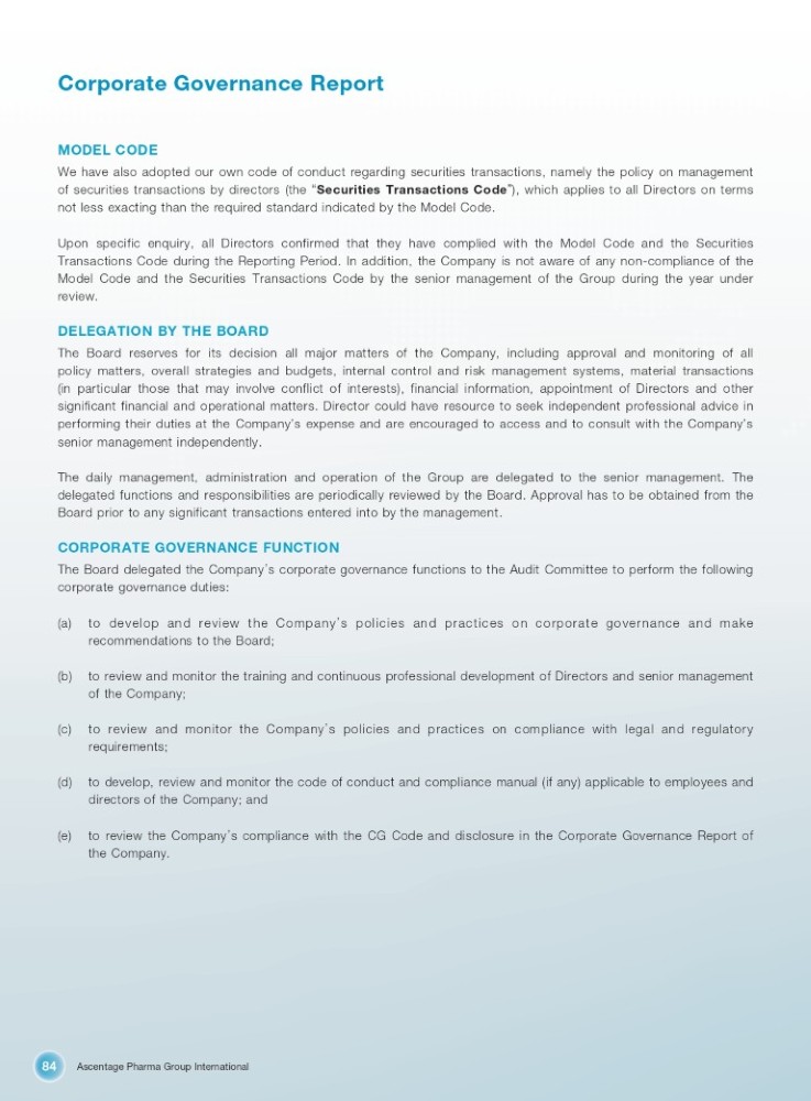 Ascentage Pharma Group International 84 Corporate Governance Report MODEL CODE We have also adopted our own code of conduct regarding securities transactions, namely the policy on management of securities transactions by directors (the “ Securities Transactions Code ” ), which applies to all Directors on terms not less exacting than the required standard indicated by the Model Code . Upon specific enquiry, all Directors confirmed that they have complied with the Model Code and the Securities Transactions Code during the Reporting Period . In addition, the Company is not aware of any non - compliance of the Model Code and the Securities Transactions Code by the senior management of the Group during the year under review . DELEGATION BY THE BOARD The Board reserves for its decision all major matters of the Company, including approval and monitoring of all policy matters, overall strategies and budgets, internal control and risk management systems, material transactions (in particular those that may involve conflict of interests), financial information, appointment of Directors and other significant financial and operational matters . Director could have resource to seek independent professional advice in performing their duties at the Company ’ s expense and are encouraged to access and to consult with the Company ’ s senior management independently . The daily management, administration and operation of the Group are delegated to the senior management . The delegated functions and responsibilities are periodically reviewed by the Board . Approval has to be obtained from the Board prior to any significant transactions entered into by the management . CORPORATE GOVERNANCE FUNCTION The Board delegated the Company ’ s corporate governance functions to the Audit Committee to perform the following corporate governance duties : (a) to develop and review the Company ’ s policies and practices on corporate governance and make recommendations to the Board; (b) to review and monitor the training and continuous professional development of Directors and senior management of the Company; (c) to review and monitor the Company ’ s policies and practices on compliance with legal and regulatory requirements; (d) to develop, review and monitor the code of conduct and compliance manual (if any) applicable to employees and directors of the Company; and (e) to review the Company ’ s compliance with the CG Code and disclosure in the Corporate Governance Report of the Company.