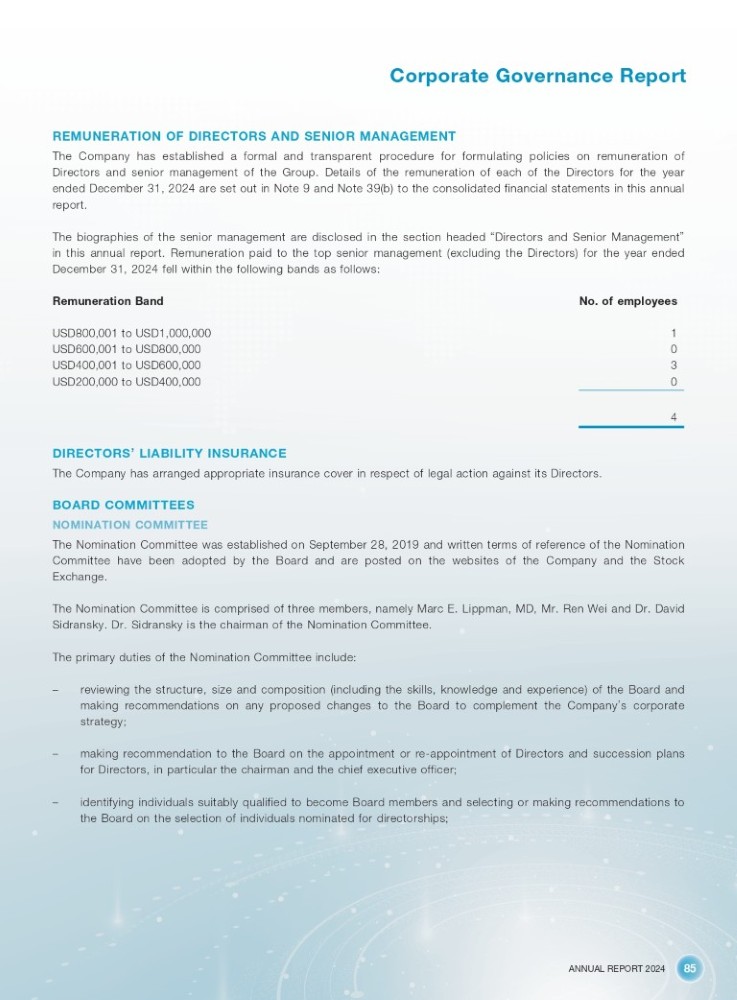 ANNUAL REPORT 2024 85 Corporate Governance Report REMUNERATION OF DIRECTORS AND SENIOR MANAGEMENT The Company has established a formal and transparent procedure for formulating policies on remuneration of Directors and senior management of the Group . Details of the remuneration of each of the Directors for the year ended December 31 , 2024 are set out in Note 9 and Note 39 (b) to the consolidated financial statements in this annual report . The biographies of the senior management are disclosed in the section headed “ Directors and Senior Management ” in this annual report . Remuneration paid to the top senior management (excluding the Directors) for the year ended December 31 , 2024 fell within the following bands as follows : No. of employees Remuneration Band 1 USD800,001 to USD1,000,000 0 USD600,001 to USD800,000 3 USD400,001 to USD600,000 0 USD200,000 to USD400,000 4 DIRECTORS ’ LIABILITY INSURANCE The Company has arranged appropriate insurance cover in respect of legal action against its Directors . BOARD COMMITTEES NOMINATION COMMITTEE The Nomination Committee was established on September 28 , 2019 and written terms of reference of the Nomination Committee have been adopted by the Board and are posted on the websites of the Company and the Stock Exchange . The Nomination Committee is comprised of three members, namely Marc E . Lippman, MD, Mr . Ren Wei and Dr . David Sidransky . Dr . Sidransky is the chairman of the Nomination Committee . The primary duties of the Nomination Committee include : – reviewing the structure, size and composition (including the skills, knowledge and experience) of the Board and making recommendations on any proposed changes to the Board to complement the Company ’ s corporate strategy ; – making recommendation to the Board on the appointment or re - appointment of Directors and succession plans for Directors, in particular the chairman and the chief executive officer ; – identifying individuals suitably qualified to become Board members and selecting or making recommendations to the Board on the selection of individuals nominated for directorships ;