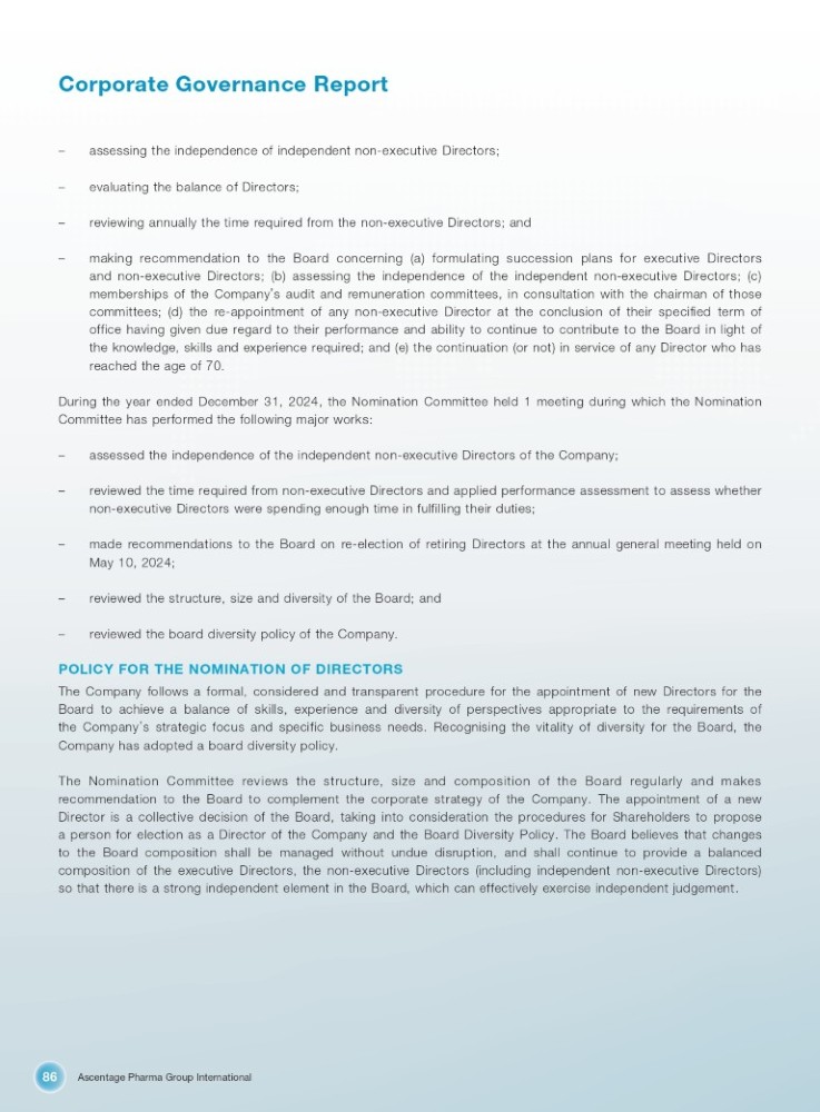 Ascentage Pharma Group International 86 Corporate Governance Report – assessing the independence of independent non - executive Directors; – evaluating the balance of Directors; – reviewing annually the time required from the non - executive Directors; and – making recommendation to the Board concerning (a) formulating succession plans for executive Directors and non - executive Directors ; (b) assessing the independence of the independent non - executive Directors ; (c) memberships of the Company ’ s audit and remuneration committees, in consultation with the chairman of those committees ; (d) the re - appointment of any non - executive Director at the conclusion of their specified term of office having given due regard to their performance and ability to continue to contribute to the Board in light of the knowledge, skills and experience required ; and (e) the continuation (or not) in service of any Director who has reached the age of 70 . During the year ended December 31 , 2024 , the Nomination Committee held 1 meeting during which the Nomination Committee has performed the following major works : – assessed the independence of the independent non - executive Directors of the Company; – reviewed the time required from non - executive Directors and applied performance assessment to assess whether non - executive Directors were spending enough time in fulfilling their duties ; – made recommendations to the Board on re - election of retiring Directors at the annual general meeting held on May 10 , 2024 ; – reviewed the structure, size and diversity of the Board; and – reviewed the board diversity policy of the Company. POLICY FOR THE NOMINATION OF DIRECTORS The Company follows a formal, considered and transparent procedure for the appointment of new Directors for the Board to achieve a balance of skills, experience and diversity of perspectives appropriate to the requirements of the Company ’ s strategic focus and specific business needs . Recognising the vitality of diversity for the Board, the Company has adopted a board diversity policy . The Nomination Committee reviews the structure, size and composition of the Board regularly and makes recommendation to the Board to complement the corporate strategy of the Company . The appointment of a new Director is a collective decision of the Board, taking into consideration the procedures for Shareholders to propose a person for election as a Director of the Company and the Board Diversity Policy . The Board believes that changes to the Board composition shall be managed without undue disruption, and shall continue to provide a balanced composition of the executive Directors, the non - executive Directors (including independent non - executive Directors) so that there is a strong independent element in the Board, which can effectively exercise independent judgement .
