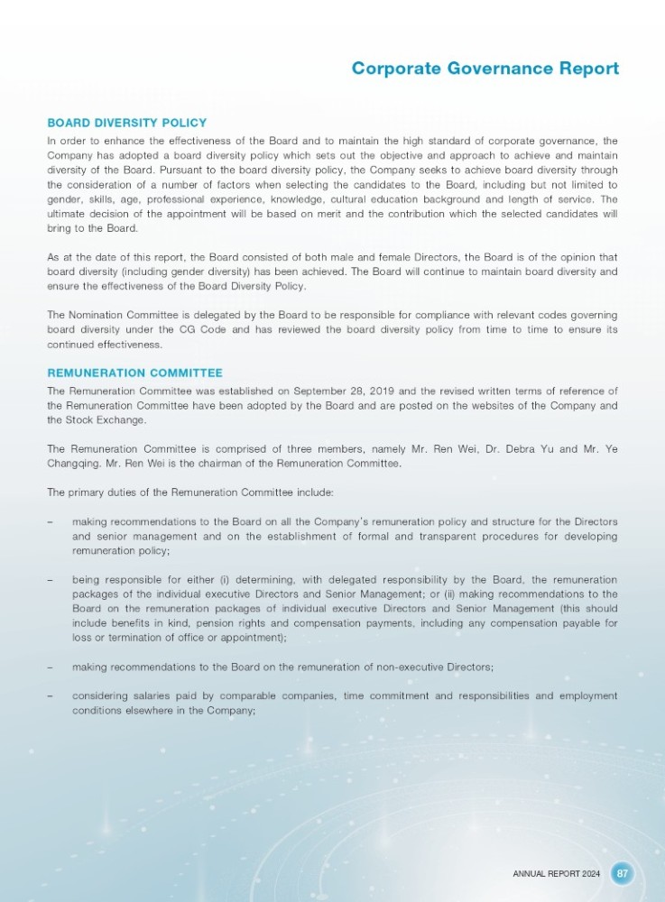 ANNUAL REPORT 2024 87 Corporate Governance Report BOARD DIVERSITY POLICY In order to enhance the effectiveness of the Board and to maintain the high standard of corporate governance, the Company has adopted a board diversity policy which sets out the objective and approach to achieve and maintain diversity of the Board . Pursuant to the board diversity policy, the Company seeks to achieve board diversity through the consideration of a number of factors when selecting the candidates to the Board, including but not limited to gender, skills, age, professional experience, knowledge, cultural education background and length of service . The ultimate decision of the appointment will be based on merit and the contribution which the selected candidates will bring to the Board . As at the date of this report, the Board consisted of both male and female Directors, the Board is of the opinion that board diversity (including gender diversity) has been achieved . The Board will continue to maintain board diversity and ensure the effectiveness of the Board Diversity Policy . The Nomination Committee is delegated by the Board to be responsible for compliance with relevant codes governing board diversity under the CG Code and has reviewed the board diversity policy from time to time to ensure its continued effectiveness . REMUNERATION COMMITTEE The Remuneration Committee was established on September 28 , 2019 and the revised written terms of reference of the Remuneration Committee have been adopted by the Board and are posted on the websites of the Company and the Stock Exchange . The Remuneration Committee is comprised of three members, namely Mr . Ren Wei, Dr . Debra Yu and Mr . Ye Changqing . Mr . Ren Wei is the chairman of the Remuneration Committee . The primary duties of the Remuneration Committee include : – making recommendations to the Board on all the Company ’ s remuneration policy and structure for the Directors and senior management and on the establishment of formal and transparent procedures for developing remuneration policy ; – being responsible for either (i) determining, with delegated responsibility by the Board, the remuneration packages of the individual executive Directors and Senior Management ; or (ii) making recommendations to the Board on the remuneration packages of individual executive Directors and Senior Management (this should include benefits in kind, pension rights and compensation payments, including any compensation payable for loss or termination of office or appointment) ; – making recommendations to the Board on the remuneration of non - executive Directors ; – considering salaries paid by comparable companies, time commitment and responsibilities and employment conditions elsewhere in the Company ;