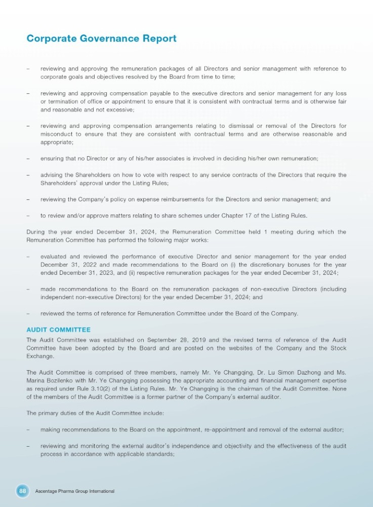 Ascentage Pharma Group International 88 Corporate Governance Report – reviewing and approving the remuneration packages of all Directors and senior management with reference to corporate goals and objectives resolved by the Board from time to time ; – reviewing and approving compensation payable to the executive directors and senior management for any loss or termination of office or appointment to ensure that it is consistent with contractual terms and is otherwise fair and reasonable and not excessive ; – reviewing and approving compensation arrangements relating to dismissal or removal of the Directors for misconduct to ensure that they are consistent with contractual terms and are otherwise reasonable and appropriate ; – ensuring that no Director or any of his/her associates is involved in deciding his/her own remuneration; – advising the Shareholders on how to vote with respect to any service contracts of the Directors that require the Shareholders ’ approval under the Listing Rules ; – reviewing the Company ’ s policy on expense reimbursements for the Directors and senior management; and – to review and/or approve matters relating to share schemes under Chapter 17 of the Listing Rules. During the year ended December 31 , 2024 , the Remuneration Committee held 1 meeting during which the Remuneration Committee has performed the following major works : – evaluated and reviewed the performance of executive Director and senior management for the year ended December 31 , 2022 and made recommendations to the Board on (i) the discretionary bonuses for the year ended December 31 , 2023 , and (ii) respective remuneration packages for the year ended December 31 , 2024 ; – made recommendations to the Board on the remuneration packages of non - executive Directors (including independent non - executive Directors) for the year ended December 31 , 2024 ; and – reviewed the terms of reference for Remuneration Committee under the Board of the Company. AUDIT COMMITTEE The Audit Committee was established on September 28 , 2019 and the revised terms of reference of the Audit Committee have been adopted by the Board and are posted on the websites of the Company and the Stock Exchange . The Audit Committee is comprised of three members, namely Mr . Ye Changqing, Dr . Lu Simon Dazhong and Ms . Marina Bozilenko with Mr . Ye Changqing possessing the appropriate accounting and financial management expertise as required under Rule 3 . 10 ( 2 ) of the Listing Rules . Mr . Ye Changqing is the chairman of the Audit Committee . None of the members of the Audit Committee is a former partner of the Company ’ s external auditor . The primary duties of the Audit Committee include: – making recommendations to the Board on the appointment, re - appointment and removal of the external auditor; – reviewing and monitoring the external auditor ’ s independence and objectivity and the effectiveness of the audit process in accordance with applicable standards ;