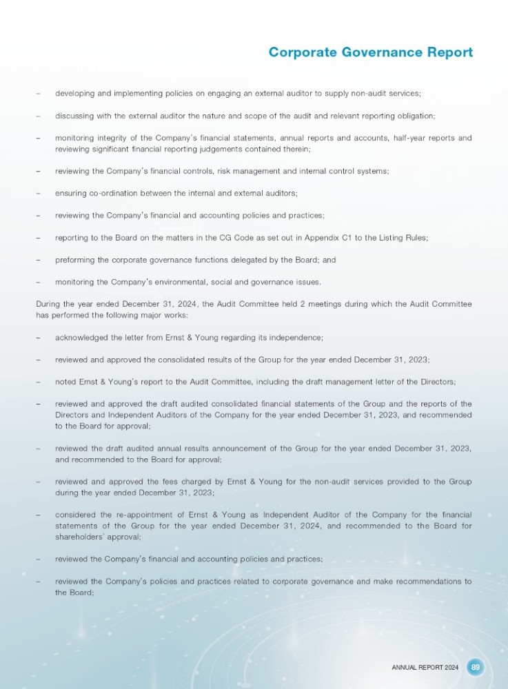 ANNUAL REPORT 2024 89 Corporate Governance Report – developing and implementing policies on engaging an external auditor to supply non - audit services; – discussing with the external auditor the nature and scope of the audit and relevant reporting obligation; – monitoring integrity of the Company ’ s financial statements, annual reports and accounts, half - year reports and reviewing significant financial reporting judgements contained therein ; – reviewing the Company ’ s financial controls, risk management and internal control systems; – ensuring co - ordination between the internal and external auditors; – reviewing the Company ’ s financial and accounting policies and practices; – reporting to the Board on the matters in the CG Code as set out in Appendix C1 to the Listing Rules; – preforming the corporate governance functions delegated by the Board; and – monitoring the Company ’ s environmental, social and governance issues. During the year ended December 31, 2024, the Audit Committee held 2 meetings during which the Audit Committee has performed the following major works: – acknowledged the letter from Ernst & Young regarding its independence; – reviewed and approved the consolidated results of the Group for the year ended December 31, 2023; – noted Ernst & Young ’ s report to the Audit Committee, including the draft management letter of the Directors; – reviewed and approved the draft audited consolidated financial statements of the Group and the reports of the Directors and Independent Auditors of the Company for the year ended December 31 , 2023 , and recommended to the Board for approval ; – reviewed the draft audited annual results announcement of the Group for the year ended December 31 , 2023 , and recommended to the Board for approval ; – reviewed and approved the fees charged by Ernst & Young for the non - audit services provided to the Group during the year ended December 31 , 2023 ; – considered the re - appointment of Ernst & Young as Independent Auditor of the Company for the financial statements of the Group for the year ended December 31 , 2024 , and recommended to the Board for shareholders ’ approval ; – reviewed the Company ’ s financial and accounting policies and practices; – reviewed the Company ’ s policies and practices related to corporate governance and make recommendations to the Board ;
