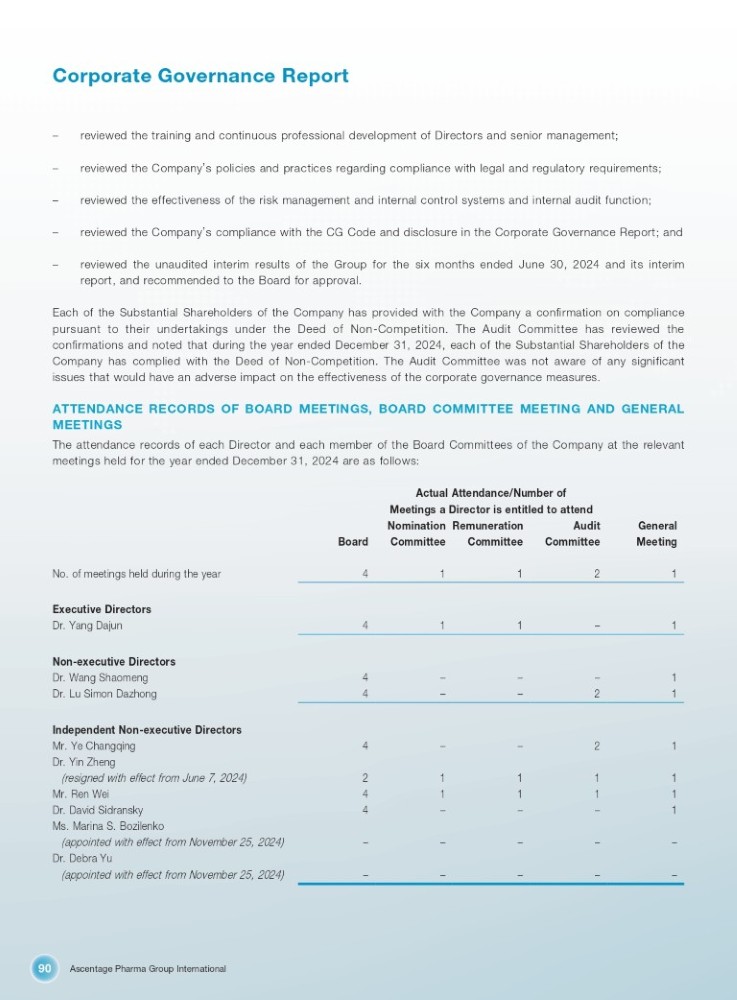 Ascentage Pharma Group International 90 Corporate Governance Report – reviewed the training and continuous professional development of Directors and senior management; – reviewed the Company ’ s policies and practices regarding compliance with legal and regulatory requirements; – reviewed the effectiveness of the risk management and internal control systems and internal audit function; – reviewed the Company ’ s compliance with the CG Code and disclosure in the Corporate Governance Report; and – reviewed the unaudited interim results of the Group for the six months ended June 30, 2024 and its interim report, and recommended to the Board for approval. Each of the Substantial Shareholders of the Company has provided with the Company a confirmation on compliance pursuant to their undertakings under the Deed of Non - Competition . The Audit Committee has reviewed the confirmations and noted that during the year ended December 31 , 2024 , each of the Substantial Shareholders of the Company has complied with the Deed of Non - Competition . The Audit Committee was not aware of any significant issues that would have an adverse impact on the effectiveness of the corporate governance measures . ATTENDANCE RECORDS OF BOARD MEETINGS, BOARD COMMITTEE MEETING AND GENERAL MEETINGS The attendance records of each Director and each member of the Board Committees of the Company at the relevant meetings held for the year ended December 31 , 2024 are as follows : Actual Attendance/Number of Meetings a Director is entitled to attend No. of meetings held during the year Executive Directors Dr. Yang Dajun Non - executive Directors Dr. Wang Shaomeng Dr. Lu Simon Dazhong Independent Non - executive Directors Mr. Ye Changqing Dr. Yin Zheng (resigned with effect from June 7, 2024) Mr. Ren Wei Dr. David Sidransky Ms. Marina S. Bozilenko (appointed with effect from November 25, 2024) Dr. Debra Yu (appointed with effect from November 25, 2024) General Meeting Audit Committee Remuneration Committee Nomination Committee Board 1 2 1 1 4 1 – 1 1 4 1 – – – 4 1 2 – – 4 1 1 2 1 – 1 – 1 4 2 1 1 1 1 4 1 – – – – – – – – – – – 4 – –