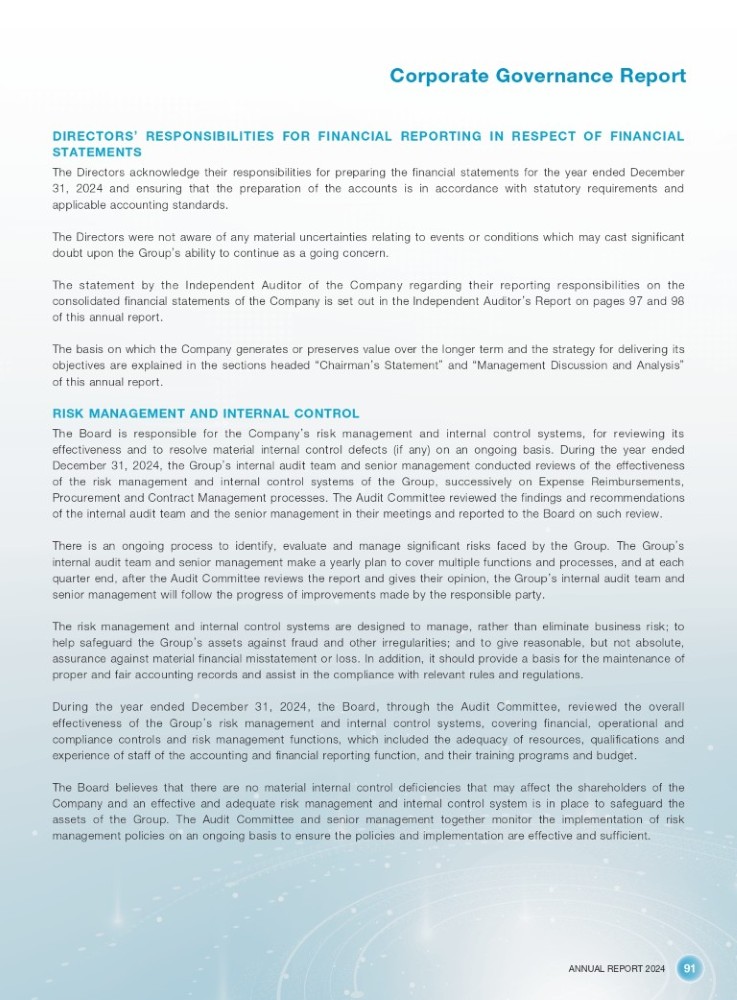 ANNUAL REPORT 2024 91 Corporate Governance Report DIRECTORS ’ RESPONSIBILITIES FOR FINANCIAL REPORTING IN RESPECT OF FINANCIAL STATEMENTS The Directors acknowledge their responsibilities for preparing the financial statements for the year ended December 31 , 2024 and ensuring that the preparation of the accounts is in accordance with statutory requirements and applicable accounting standards . The Directors were not aware of any material uncertainties relating to events or conditions which may cast significant doubt upon the Group ’ s ability to continue as a going concern . The statement by the Independent Auditor of the Company regarding their reporting responsibilities on the consolidated financial statements of the Company is set out in the Independent Auditor ’ s Report on pages 97 and 98 of this annual report . The basis on which the Company generates or preserves value over the longer term and the strategy for delivering its objectives are explained in the sections headed “ Chairman ’ s Statement ” and “ Management Discussion and Analysis ” of this annual report . RISK MANAGEMENT AND INTERNAL CONTROL The Board is responsible for the Company ’ s risk management and internal control systems, for reviewing its effectiveness and to resolve material internal control defects (if any) on an ongoing basis . During the year ended December 31 , 2024 , the Group ’ s internal audit team and senior management conducted reviews of the effectiveness of the risk management and internal control systems of the Group, successively on Expense Reimbursements, Procurement and Contract Management processes . The Audit Committee reviewed the findings and recommendations of the internal audit team and the senior management in their meetings and reported to the Board on such review . There is an ongoing process to identify, evaluate and manage significant risks faced by the Group . The Group ’ s internal audit team and senior management make a yearly plan to cover multiple functions and processes, and at each quarter end, after the Audit Committee reviews the report and gives their opinion, the Group ’ s internal audit team and senior management will follow the progress of improvements made by the responsible party . The risk management and internal control systems are designed to manage, rather than eliminate business risk ; to help safeguard the Group ’ s assets against fraud and other irregularities ; and to give reasonable, but not absolute, assurance against material financial misstatement or loss . In addition, it should provide a basis for the maintenance of proper and fair accounting records and assist in the compliance with relevant rules and regulations . During the year ended December 31 , 2024 , the Board, through the Audit Committee, reviewed the overall effectiveness of the Group ’ s risk management and internal control systems, covering financial, operational and compliance controls and risk management functions, which included the adequacy of resources, qualifications and experience of staff of the accounting and financial reporting function, and their training programs and budget . The Board believes that there are no material internal control deficiencies that may affect the shareholders of the Company and an effective and adequate risk management and internal control system is in place to safeguard the assets of the Group . The Audit Committee and senior management together monitor the implementation of risk management policies on an ongoing basis to ensure the policies and implementation are effective and sufficient .