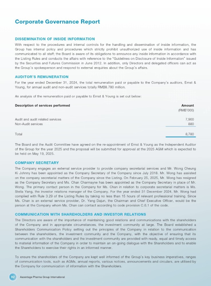 Ascentage Pharma Group International 92 Corporate Governance Report DISSEMINATION OF INSIDE INFORMATION With respect to the procedures and internal controls for the handling and dissemination of inside information, the Group has internal policy and procedures which strictly prohibit unauthorized use of inside information and has communicated to all staff ; the Board is aware of its obligations to announce any inside information in accordance with the Listing Rules and conducts the affairs with reference to the “ Guidelines on Disclosure of Inside Information ” issued by the Securities and Futures Commission in June 2012 . In addition, only Directors and delegated officers can act as the Group ’ s spokesperson and respond to external enquiries about the Group ’ s affairs . AUDITOR ’ S REMUNERATION For the year ended December 31 , 2024 , the total remuneration paid or payable to the Company ’ s auditors, Ernst & Young, for annual audit and non - audit services totally RMB 8 . 780 million . An analysis of the remuneration paid or payable to Ernst & Young is set out below : Description of services performed Amount (RMB ’ 000) Audit and audit related services Non - Audit services 7,900 880 Total 8 , 780 The Board and the Audit Committee have agreed on the re - appointment of Ernst & Young as the Independent Auditor of the Group for the year 2025 and the proposal will be submitted for approval at the 2025 AGM which is expected to be held on May 19 , 2025 . COMPANY SECRETARY The Company engages an external service provider to provide company secretarial services and Mr . Wong Cheung Ki Johnny has been appointed as the Company Secretary of the Company since July 2018 . Mr . Wong has assisted on the company secretarial matters of the Company since the Listing . On February 25 , 2025 , Mr . Wong has resigned as the Company Secretary and Ms . Chan Charmayne has been appointed as the Company Secretary in place of Mr . Wong . The primary contact person in the Company for Ms . Chan in relation to corporate secretarial matters is Ms . Stella Yang, the investor relations manager of the Company . For the year ended 31 December 2024 , Mr . Wong had complied with Rule 3 . 29 of the Listing Rules by taking no less than 15 hours of relevant professional training . Since Ms . Chan is an external service provider, Dr . Yang Dajun, the Chairman and Chief Executive Officer, would be the person at the Company whom Ms . Chan can contact according to code provision C . 6 . 1 of the code . COMMUNICATION WITH SHAREHOLDERS AND INVESTOR RELATIONS The Directors are aware of the importance of maintaining good relations and communications with the shareholders of the Company and in appropriate circumstances, the investment community at large . The Board established a Shareholders Communication Policy setting out the principles of the Company in relation to the communication between the shareholders, the investment community and the Company, with the objective of ensuring that its communication with the shareholders and the investment community are provided with ready, equal and timely access to material information of the Company in order to maintain an on - going dialogue with the Shareholders and to enable the Shareholders to exercise their rights in an informed manner . To ensure the shareholders of the Company are kept well informed of the Group ’ s key business imperatives, ranges of communication tools, such as AGMs, annual reports, various notices, announcements and circulars, are utilised by the Company for communication of information with the Shareholders .