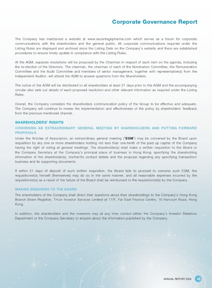 ANNUAL REPORT 2024 93 Corporate Governance Report The Company has maintained a website at www . ascentagepharma . com which serves as a forum for corporate communications with the shareholders and the general public . All corporate communications required under the Listing Rules are displayed and archived since the Listing Date on the Company ’ s website and there are established procedures to ensure timely update in compliance with the Listing Rules . At the AGM, separate resolutions will be proposed by the Chairman in respect of each item on the agenda, including the re - election of the Directors . The chairman, the chairman of each of the Nomination Committee, the Remuneration Committee and the Audit Committee and members of senior management, together with representative(s) from the Independent Auditor, will attend the AGM to answer questions from the Shareholders . The notice of the AGM will be distributed to all shareholders at least 21 days prior to the AGM and the accompanying circular also sets out details of each proposed resolution and other relevant information as required under the Listing Rules . Overall, the Company considers the shareholders communication policy of the Group to be effective and adequate . The Company will continue to review the implementation and effectiveness of the policy by shareholders ’ feedback from the previous mentioned channel . SHAREHOLDERS ’ RIGHTS CONVENING AN EXTRAORDINARY GENERAL MEETING BY SHAREHOLDERS AND PUTTING FORWARD PROPOSALS Under the Articles of Association, an extraordinary general meeting ( “ EGM ” ) may be convened by the Board upon requisition by any one or more shareholders holding not less than one - tenth of the paid up capital of the Company having the right of voting at general meetings . The shareholder(s) shall make a written requisition to the Board or the Company Secretary at the Company ’ s principal place of business in Hong Kong, specifying the shareholding information of the shareholder(s), his/her/its contact details and the proposal regarding any specifying transaction/ business and its supporting documents . If within 21 days of deposit of such written requisition, the Board fails to proceed to convene such EGM, the requisitionist(s) himself (themselves) may do so in the same manner, and all reasonable expenses incurred by the requisitionist(s) as a result of the failure of the Board shall be reimbursed to the requisitionist(s) by the Company . MAKING ENQUIRIES TO THE BOARD The shareholders of the Company shall direct their questions about their shareholdings to the Company ’ s Hong Kong Branch Share Registrar, Tricor Investor Services Limited at 17 /F, Far East Finance Centre, 16 Harcourt Road, Hong Kong . In addition, the shareholders and the investors may at any time contact either the Company ’ s Investor Relations Department or the Company Secretary to enquire about the information published by the Company .