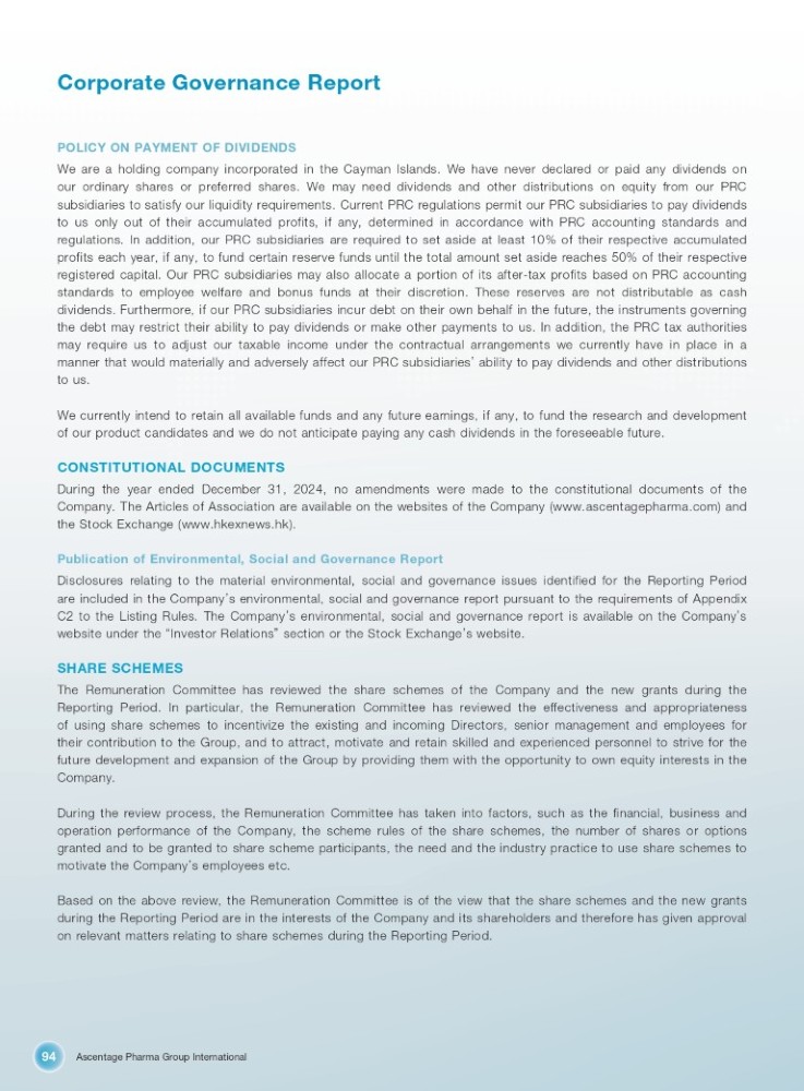 Ascentage Pharma Group International 94 Corporate Governance Report POLICY ON PAYMENT OF DIVIDENDS We are a holding company incorporated in the Cayman Islands . We have never declared or paid any dividends on our ordinary shares or preferred shares . We may need dividends and other distributions on equity from our PRC subsidiaries to satisfy our liquidity requirements . Current PRC regulations permit our PRC subsidiaries to pay dividends to us only out of their accumulated profits, if any, determined in accordance with PRC accounting standards and regulations . In addition, our PRC subsidiaries are required to set aside at least 10 % of their respective accumulated profits each year, if any, to fund certain reserve funds until the total amount set aside reaches 50 % of their respective registered capital . Our PRC subsidiaries may also allocate a portion of its after - tax profits based on PRC accounting standards to employee welfare and bonus funds at their discretion . These reserves are not distributable as cash dividends . Furthermore, if our PRC subsidiaries incur debt on their own behalf in the future, the instruments governing the debt may restrict their ability to pay dividends or make other payments to us . In addition, the PRC tax authorities may require us to adjust our taxable income under the contractual arrangements we currently have in place in a manner that would materially and adversely affect our PRC subsidiaries ’ ability to pay dividends and other distributions to us . We currently intend to retain all available funds and any future earnings, if any, to fund the research and development of our product candidates and we do not anticipate paying any cash dividends in the foreseeable future . CONSTITUTIONAL DOCUMENTS During the year ended December 31 , 2024 , no amendments were made to the constitutional documents of the Company . The Articles of Association are available on the websites of the Company (www . ascentagepharma . com) and the Stock Exchange (www . hkexnews . hk) . Publication of Environmental, Social and Governance Report Disclosures relating to the material environmental, social and governance issues identified for the Reporting Period are included in the Company ’ s environmental, social and governance report pursuant to the requirements of Appendix C 2 to the Listing Rules . The Company ’ s environmental, social and governance report is available on the Company ’ s website under the “ Investor Relations ” section or the Stock Exchange ’ s website . SHARE SCHEMES The Remuneration Committee has reviewed the share schemes of the Company and the new grants during the Reporting Period . In particular, the Remuneration Committee has reviewed the effectiveness and appropriateness of using share schemes to incentivize the existing and incoming Directors, senior management and employees for their contribution to the Group, and to attract, motivate and retain skilled and experienced personnel to strive for the future development and expansion of the Group by providing them with the opportunity to own equity interests in the Company . During the review process, the Remuneration Committee has taken into factors, such as the financial, business and operation performance of the Company, the scheme rules of the share schemes, the number of shares or options granted and to be granted to share scheme participants, the need and the industry practice to use share schemes to motivate the Company ’ s employees etc . Based on the above review, the Remuneration Committee is of the view that the share schemes and the new grants during the Reporting Period are in the interests of the Company and its shareholders and therefore has given approval on relevant matters relating to share schemes during the Reporting Period .