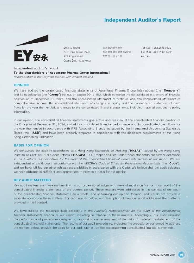 ANNUAL REPORT 2024 95 Independent Auditor ’ s Report Ernst & Young 27/F, One Taikoo Place 979 King ’ s Road Quarry Bay, Hong Kong ᆹ≨ᴳ䀸ᑛһउᡰ 俉⑟刲冊⎼㤡ⲷ䚃 979 㲏 ཚਔൺаᓗ 27 ⁃ Tel 䴫䂡 : +852 2846 9888 Fax ۣⵏ : +852 2868 4432 ey.com Independent auditor ’ s report To the shareholders of Ascentage Pharma Group International (Incorporated in the Cayman Islands with limited liability) OPINION We have audited the consolidated financial statements of Ascentage Pharma Group International (the “ Company ” ) and its subsidiaries (the “ Group ” ) set out on pages 99 to 182 , which comprise the consolidated statement of financial position as at December 31 , 2024 , and the consolidated statement of profit or loss, the consolidated statement of comprehensive income, the consolidated statement of changes in equity and the consolidated statement of cash flows for the year then ended, and notes to the consolidated financial statements, including material accounting policy information . In our opinion, the consolidated financial statements give a true and fair view of the consolidated financial position of the Group as at December 31 , 2024 , and of its consolidated financial performance and its consolidated cash flows for the year then ended in accordance with IFRS Accounting Standards issued by the International Accounting Standards Board (the “ IASB ” ) and have been properly prepared in compliance with the disclosure requirements of the Hong Kong Companies Ordinance . BASIS FOR OPINION We conducted our audit in accordance with Hong Kong Standards on Auditing ( “ HKSAs ” ) issued by the Hong Kong Institute of Certified Public Accountants ( “ HKICPA ” ) . Our responsibilities under those standards are further described in the Auditor ’ s responsibilities for the audit of the consolidated financial statements section of our report . We are independent of the Group in accordance with the HKICPA ’ s Code of Ethics for Professional Accountants (the “ Code ” ), and we have fulfilled our other ethical responsibilities in accordance with the Code . We believe that the audit evidence we have obtained is sufficient and appropriate to provide a basis for our opinion . KEY AUDIT MATTERS Key audit matters are those matters that, in our professional judgement, were of most significance in our audit of the consolidated financial statements of the current period . These matters were addressed in the context of our audit of the consolidated financial statements as a whole, and in forming our opinion thereon, and we do not provide a separate opinion on these matters . For each matter below, our description of how our audit addressed the matter is provided in that context . We have fulfilled the responsibilities described in the Auditor ’ s responsibilities for the audit of the consolidated financial statements section of our report, including in relation to these matters . Accordingly, our audit included the performance of procedures designed to respond to our assessment of the risks of material misstatement of the consolidated financial statements . The results of our audit procedures, including the procedures performed to address the matters below, provide the basis for our audit opinion on the accompanying consolidated financial statements .