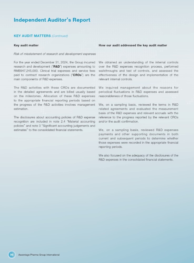Ascentage Pharma Group International 96 Independent Auditor ’ s Report KEY AUDIT MATTERS (Continued) Key audit matter How our audit addressed the key audit matter Risk of misstatement of research and development expenses For the year ended December 31 , 2024 , the Group incurred research and development ( “ R&D ” ) expenses amounting to RMB 947 , 245 , 000 . Clinical trial expenses and service fees paid to contract research organizations ( “ CROs ” ) are the main components of R&D expenses . The R&D activities with these CROs are documented in the detailed agreements and are billed usually based on the milestones . Allocation of these R&D expenses to the appropriate financial reporting periods based on the progress of the R&D activities involves management estimation . The disclosures about accounting policies of R&D expense recognition are included in note 2 . 4 “ Material accounting policies ” and note 3 “ Significant accounting judgements and estimates ” to the consolidated financial statements . We obtained an understanding of the internal controls over the R&D expenses recognition process, performed walkthroughs and test of controls, and assessed the effectiveness of the design and implementation of the relevant internal controls . We inquired management about the reasons for periodical fluctuations in R&D expenses and assessed reasonableness of those fluctuations . We, on a sampling basis, reviewed the terms in R&D related agreements and evaluated the measurement basis of the R&D expenses and relevant accruals with the reference to the progress reported by the relevant CROs and/or the audit confirmation . We, on a sampling basis, reviewed R&D expenses payments and other supporting documents in both current and subsequent periods to determine whether those expenses were recorded in the appropriate financial reporting periods . We also focused on the adequacy of the disclosures of the R&D expenses in the consolidated financial statements.