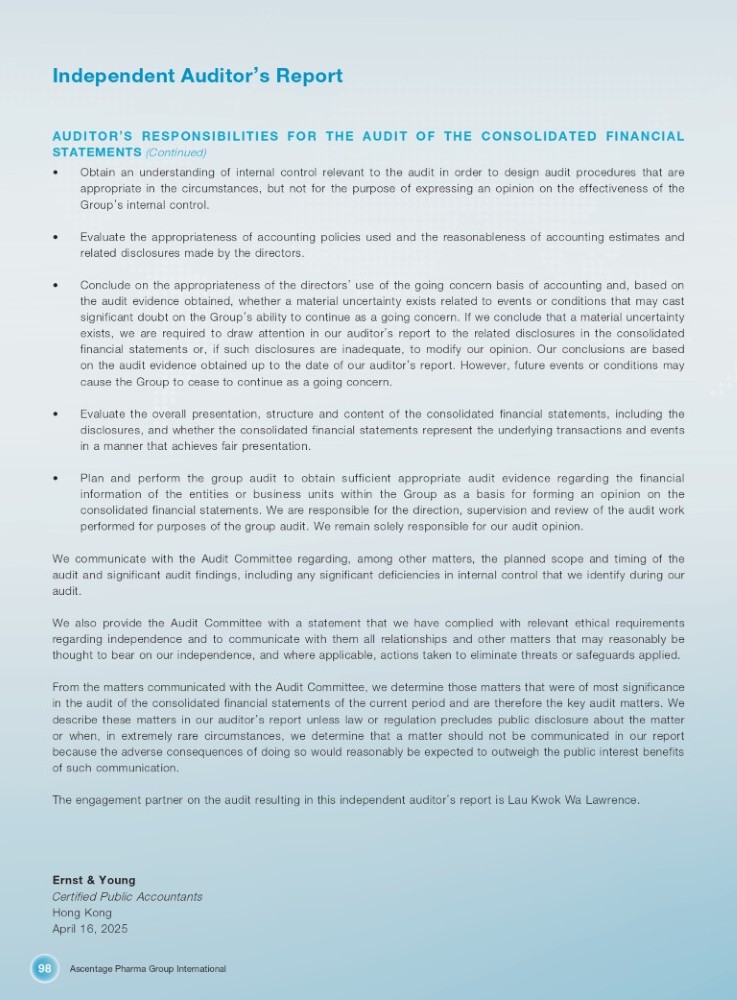 Ascentage Pharma Group International 98 Independent Auditor ’ s Report AUDITOR ’ S RESPONSIBILITIES FOR THE AUDIT OF THE CONSOLIDATED FINANCIAL STATEMENTS (Continued) • Obtain an understanding of internal control relevant to the audit in order to design audit procedures that are appropriate in the circumstances, but not for the purpose of expressing an opinion on the effectiveness of the Group ’ s internal control . • Evaluate the appropriateness of accounting policies used and the reasonableness of accounting estimates and related disclosures made by the directors . • Conclude on the appropriateness of the directors ’ use of the going concern basis of accounting and, based on the audit evidence obtained, whether a material uncertainty exists related to events or conditions that may cast significant doubt on the Group ’ s ability to continue as a going concern . If we conclude that a material uncertainty exists, we are required to draw attention in our auditor ’ s report to the related disclosures in the consolidated financial statements or, if such disclosures are inadequate, to modify our opinion . Our conclusions are based on the audit evidence obtained up to the date of our auditor ’ s report . However, future events or conditions may cause the Group to cease to continue as a going concern . • Evaluate the overall presentation, structure and content of the consolidated financial statements, including the disclosures, and whether the consolidated financial statements represent the underlying transactions and events in a manner that achieves fair presentation . • Plan and perform the group audit to obtain sufficient appropriate audit evidence regarding the financial information of the entities or business units within the Group as a basis for forming an opinion on the consolidated financial statements . We are responsible for the direction, supervision and review of the audit work performed for purposes of the group audit . We remain solely responsible for our audit opinion . We communicate with the Audit Committee regarding, among other matters, the planned scope and timing of the audit and significant audit findings, including any significant deficiencies in internal control that we identify during our audit . We also provide the Audit Committee with a statement that we have complied with relevant ethical requirements regarding independence and to communicate with them all relationships and other matters that may reasonably be thought to bear on our independence, and where applicable, actions taken to eliminate threats or safeguards applied . From the matters communicated with the Audit Committee, we determine those matters that were of most significance in the audit of the consolidated financial statements of the current period and are therefore the key audit matters . We describe these matters in our auditor ’ s report unless law or regulation precludes public disclosure about the matter or when, in extremely rare circumstances, we determine that a matter should not be communicated in our report because the adverse consequences of doing so would reasonably be expected to outweigh the public interest benefits of such communication . The engagement partner on the audit resulting in this independent auditor ’ s report is Lau Kwok Wa Lawrence . Ernst & Young Certified Public Accountants Hong Kong April 16, 2025