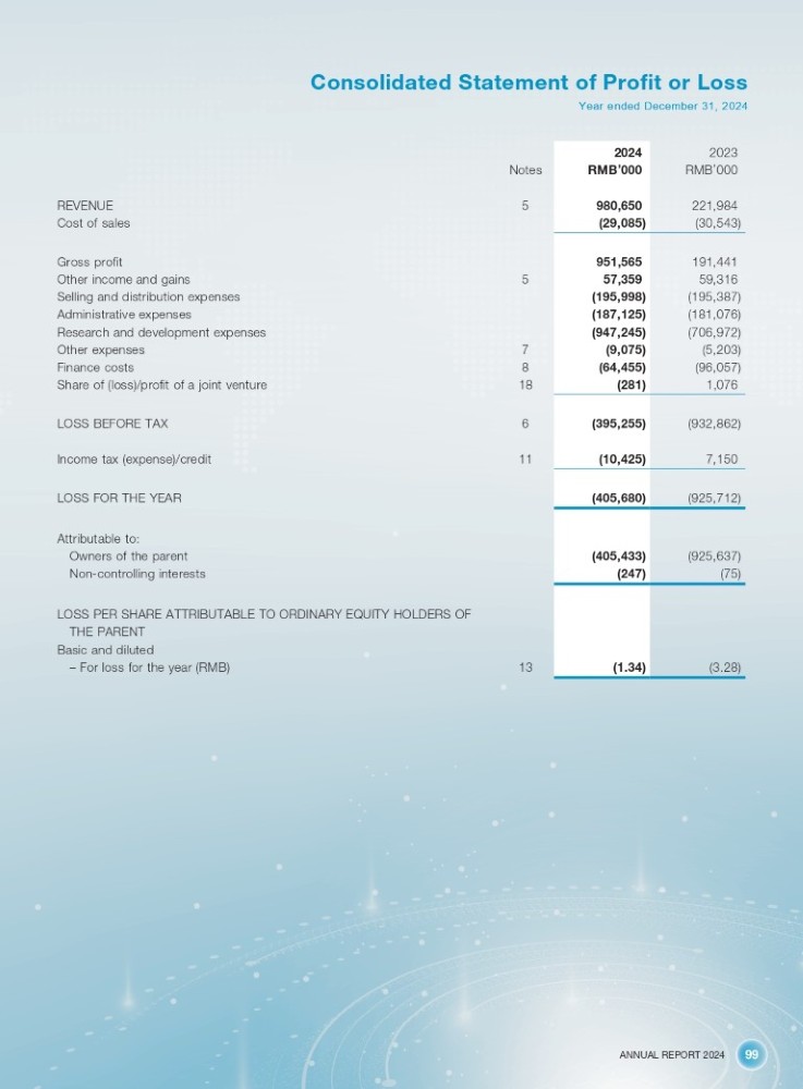 ANNUAL REPORT 2024 99 Consolidated Statement of Profit or Loss Year ended December 31, 2024 Notes 5 REVENUE Cost of sales 5 Gross profit Other income and gains 7 Selling and distribution expenses Administrative expenses Research and development expenses Other expenses 8 Finance costs 18 Share of (loss)/profit of a joint venture 6 LOSS BEFORE TAX 11 Income tax (expense)/credit LOSS FOR THE YEAR Attributable to: Owners of the parent Non - controlling interests LOSS PER SHARE ATTRIBUTABLE TO ORDINARY EQUITY HOLDERS OF THE PARENT Basic and diluted – For loss for the year (RMB) 13 2023 2024 RMB ’ 000 RMB ’ 000 221,984 980,650 (30,543) (29,085) 191,441 951,565 59,316 57,359 (195,387) (195,998) (181,076) (187,125) (706,972) (947,245) (5,203) (9,075) (96,057) (64,455) 1,076 (281) (932,862) (395,255) 7,150 (10,425) (925,712) (405,680) (925,637) (405,433) (75) (247) (3.28) (1.34)
