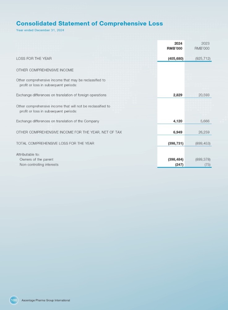 Ascentage Pharma Group International 100 Consolidated Statement of Comprehensive Loss Year ended December 31, 2024 LOSS FOR THE YEAR OTHER COMPREHENSIVE INCOME Other comprehensive income that may be reclassified to profit or loss in subsequent periods: Exchange differences on translation of foreign operations Other comprehensive income that will not be reclassified to profit or loss in subsequent periods: Exchange differences on translation of the Company OTHER COMPREHENSIVE INCOME FOR THE YEAR, NET OF TAX TOTAL COMPREHENSIVE LOSS FOR THE YEAR Attributable to: Owners of the parent Non - controlling interests 2023 2024 RMB ’ 000 RMB ’ 000 (925,712) (405,680) 20,593 2,829 5,666 4,120 26,259 6,949 (899,453) (398,731) (899,378) (398,484) (75) (247)