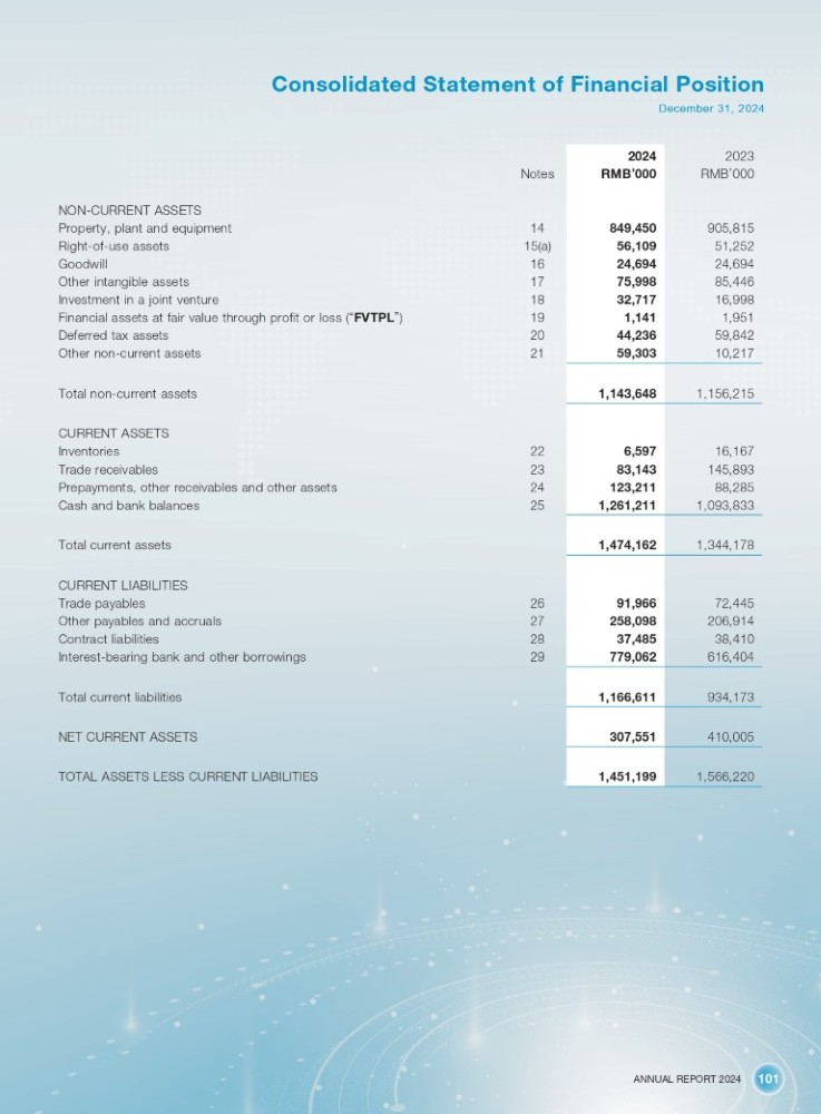 ANNUAL REPORT 2024 101 Consolidated Statement of Financial Position December 31, 2024 Notes NON - CURRENT ASSETS 14 Property, plant and equipment 15(a) Right - of - use assets 16 Goodwill 17 Other intangible assets 18 Investment in a joint venture 19 Financial assets at fair value through profit or loss ( “ FVTPL ” ) 20 Deferred tax assets 21 Other non - current assets Total non - current assets CURRENT ASSETS 22 Inventories 23 Trade receivables 24 Prepayments, other receivables and other assets 25 Cash and bank balances Total current assets CURRENT LIABILITIES 26 Trade payables 27 Other payables and accruals 28 Contract liabilities 29 Interest - bearing bank and other borrowings Total current liabilities NET CURRENT ASSETS TOTAL ASSETS LESS CURRENT LIABILITIES 2023 2024 RMB ’ 000 RMB ’ 000 905,815 849,450 51,252 56,109 24,694 24,694 85,446 75,998 16,998 32,717 1,951 1,141 59,842 44,236 10,217 59,303 1,156,215 1,143,648 16,167 6,597 145,893 83,143 88,285 123,211 1,093,833 1,261,211 1,344,178 1,474,162 72,445 91,966 206,914 258,098 38,410 37,485 616,404 779,062 934,173 1,166,611 410,005 307,551 1,566,220 1,451,199