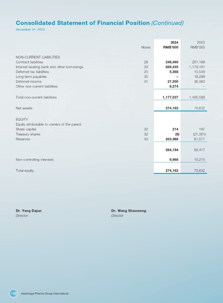Ascentage Pharma Group International 102 Consolidated Statement of Financial Position (Continued) December 31, 2024 Notes 28 NON - CURRENT LIABILITIES Contract liabilities 29 Interest - bearing bank and other borrowings 20 Deferred tax liabilities 30 Long - term payables 31 Deferred income Other non - current liabilities Total non - current liabilities Net assets 32 EQUITY Equity attributable to owners of the parent Share capital 32 Treasury shares 33 Reserves Non - controlling interests Total equity 2023 2024 RMB ’ 000 RMB ’ 000 251,189 248,460 1,179,191 889,435 10,549 5,368 18,299 – 36,360 27,500 – 6,274 1,495,588 1,177,037 70,632 274,162 197 214 (21,351) (8) 81,571 263,988 60,417 264,194 10,215 9,968 70,632 274,162 Dr. Yang Dajun Director Dr. Wang Shaomeng Director