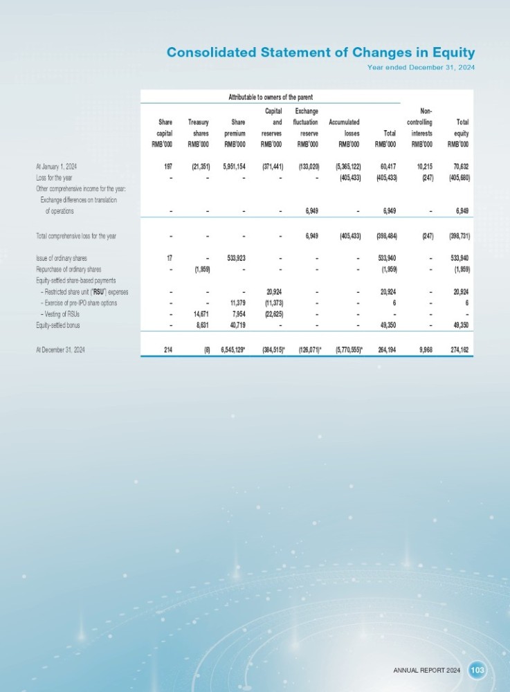 ANNUAL REPORT 2024 103 Consolidated Statement of Changes in Equity Year ended December 31, 2024 At January 1, 2024 Loss for the year Other comprehensive income for the year: Exchange differences on translation of operations Total comprehensive loss for the year Issue of ordinary shares Repurchase of ordinary shares Equity - settled share - based payments – Restricted share unit ( “ RSU ” ) expenses – Exercise of pre - IPO share options – Vesting of RSUs Equity - settled bonus At December 31, 2024 Total equity RMB ’ 000 70,632 (405,680) 6,949 Non - controlling interests RMB ’ 000 10,215 (247) – Attributable to owners of the parent Total RMB ’ 000 60,417 (405,433) 6,949 Accumulated losses RMB ’ 000 (5,365,122) (405,433) – Exchange fluctuation reserve RMB ’ 000 (133,020) – 6,949 Capital and reserves RMB ’ 000 (371,441) – – Share premium RMB ’ 000 5,951,154 – – Treasury shares RMB ’ 000 (21,351) – – Share capital RMB ’ 000 197 – – (398,731) (247) (398,484) (405,433) 6,949 – – – – 533,940 – 533,940 – – – 533,923 – 17 (1,959) – (1,959) – – – – (1,959) – 20,924 – 20,924 – – 20,924 – – – 6 – 6 – – (11,373) 11,379 – – – – – – – (22,625) 7,954 14,671 – 49,350 – 49,350 – – – 40,719 8,631 – 274,162 9,968 264,194 (5,770,555)* (126,071)* (384,515)* 6,545,129* (8) 214