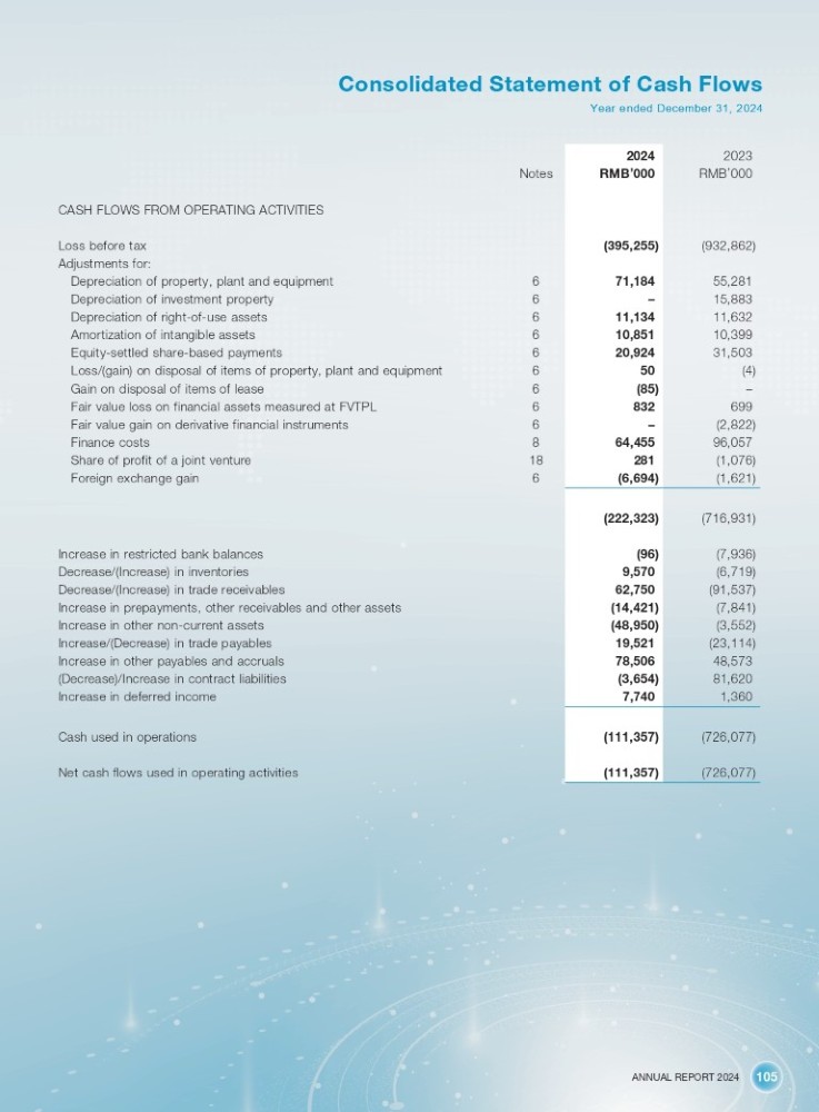 ANNUAL REPORT 2024 105 Consolidated Statement of Cash Flows Year ended December 31, 2024 Notes CASH FLOWS FROM OPERATING ACTIVITIES Loss before tax Adjustments for: 6 Depreciation of property, plant and equipment 6 Depreciation of investment property 6 Depreciation of right - of - use assets 6 Amortization of intangible assets 6 Equity - settled share - based payments 6 Loss/(gain) on disposal of items of property, plant and equipment 6 Gain on disposal of items of lease 6 Fair value loss on financial assets measured at FVTPL 6 Fair value gain on derivative financial instruments 8 Finance costs 18 Share of profit of a joint venture 6 Foreign exchange gain Increase in restricted bank balances Decrease/(Increase) in inventories Decrease/(Increase) in trade receivables Increase in prepayments, other receivables and other assets Increase in other non - current assets Increase/(Decrease) in trade payables Increase in other payables and accruals (Decrease)/Increase in contract liabilities Increase in deferred income Cash used in operations Net cash flows used in operating activities 2023 2024 RMB ’ 000 RMB ’ 000 (932,862) (395,255) 55,281 71,184 15,883 – 11,632 11,134 10,399 10,851 31,503 20,924 (4) 50 – (85) 699 832 (2,822) – 96,057 64,455 (1,076) 281 (1,621) (6,694) (716,931) (222,323) (7,936) (96) (6,719) 9,570 (91,537) 62,750 (7,841) (14,421) (3,552) (48,950) (23,114) 19,521 48,573 78,506 81,620 (3,654) 1,360 7,740 (726,077) (111,357) (726,077) (111,357)