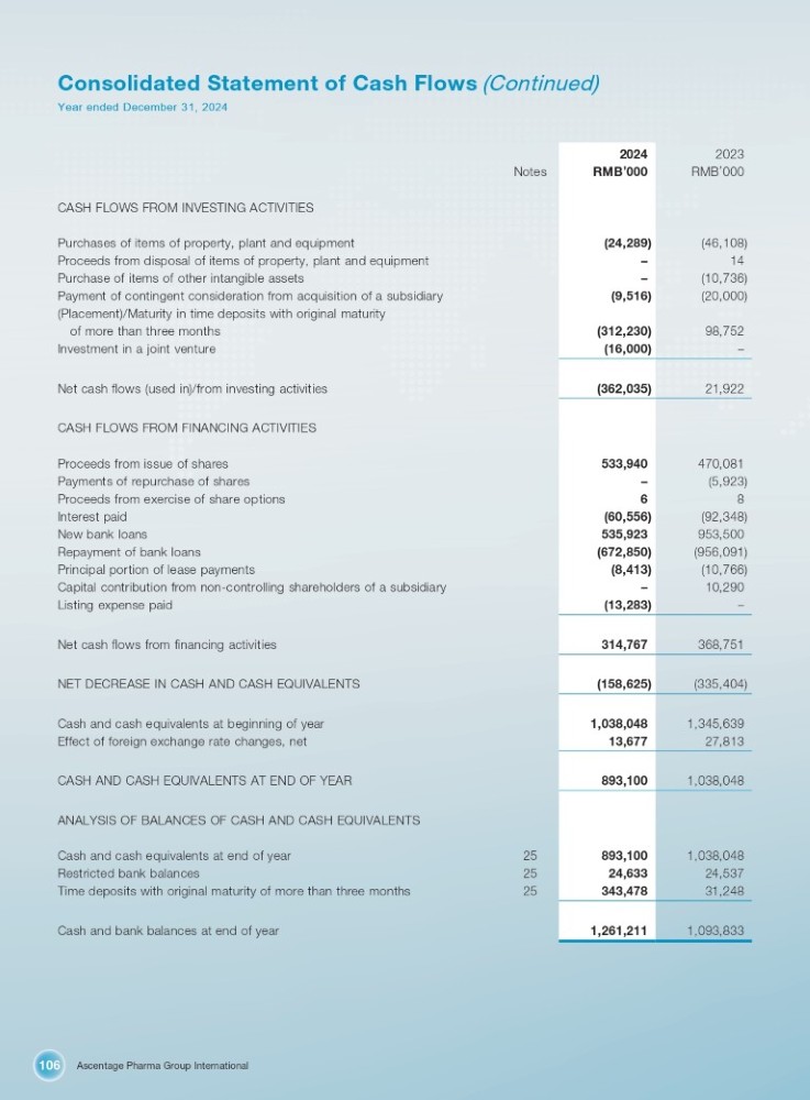 Ascentage Pharma Group International 106 Consolidated Statement of Cash Flows (Continued) Year ended December 31, 2024 Notes CASH FLOWS FROM INVESTING ACTIVITIES Purchases of items of property, plant and equipment Proceeds from disposal of items of property, plant and equipment Purchase of items of other intangible assets Payment of contingent consideration from acquisition of a subsidiary (Placement)/Maturity in time deposits with original maturity of more than three months Investment in a joint venture Net cash flows (used in)/from investing activities CASH FLOWS FROM FINANCING ACTIVITIES Proceeds from issue of shares Payments of repurchase of shares Proceeds from exercise of share options Interest paid New bank loans Repayment of bank loans Principal portion of lease payments Capital contribution from non - controlling shareholders of a subsidiary Listing expense paid Net cash flows from financing activities NET DECREASE IN CASH AND CASH EQUIVALENTS Cash and cash equivalents at beginning of year Effect of foreign exchange rate changes, net CASH AND CASH EQUIVALENTS AT END OF YEAR ANALYSIS OF BALANCES OF CASH AND CASH EQUIVALENTS Cash and cash equivalents at end of year Restricted bank balances Time deposits with original maturity of more than three months 25 25 25 Cash and bank balances at end of year 2023 2024 RMB ’ 000 RMB ’ 000 (46,108) (24,289) 14 – (10,736) – (20,000) (9,516) 98,752 (312,230) – (16,000) 21,922 (362,035) 470,081 533,940 (5,923) – 8 6 (92,348) (60,556) 953,500 535,923 (956,091) (672,850) (10,766) (8,413) 10,290 – – (13,283) 368,751 314,767 (335,404) (158,625) 1,345,639 1,038,048 27,813 13,677 1,038,048 893,100 1,038,048 893,100 24,537 24,633 31,248 343,478 1,093,833 1,261,211