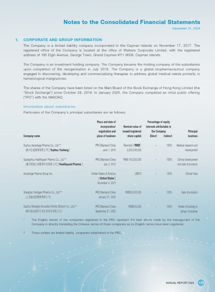 ANNUAL REPORT 2024 107 Notes to the Consolidated Financial Statements December 31, 2024 1. CORPORATE AND GROUP INFORMATION The Company is a limited liability company incorporated in the Cayman Islands on November 17 , 2017 . The registered office of the Company is located at the office of Walkers Corporate Limited, with the registered address of 190 Elgin Avenue, George Town, Grand Cayman KY 1 - 9008 , Cayman Islands . The Company is an investment holding company . The Company became the holding company of the subsidiaries upon completion of the reorganization in July 2018 . The Company is a global biopharmaceutical company engaged in discovering, developing and commercializing therapies to address global medical needs primarily in hematological malignancies . The shares of the Company have been listed on the Main Board of the Stock Exchange of Hong Kong Limited (the “ Stock Exchange ” ) since October 28 , 2019 . In January 2025 , the Company completed an initial public offering ( “ IPO ” ) with the NASDAQ . Information about subsidiaries Particulars of the Company ’ s principal subsidiaries are as follows : Company name Place and date of incorporation/ registration and place of business Nominal value of issued/registered share capital Principal business Suzhou Ascentage Pharma Co., Ltd.* @ ( 㰷ᐎӎⴋ㰕ᾝᴹ䲀ޜਨ ) ( “ Suzhou Yasheng ” ) PRC/Mainland China June 1, 2016 Renminbi ( “ RMB ” ) 2,000,000,000 Percentage of equity interests attributable to the Company Direct Indirect – 100% Medical research and development Guangzhou Healthquest Pharma Co., Ltd.* @ ( ᔓᐎ丶ڕ⭏⢙䟛㰕、ᢰᴹ䲀ޜਨ ) ( “ Healthquest Pharma ” ) PRC/Mainland China July 3, 2012 RMB 150,000,000 – 100% Clinical development and sale of products Ascentage Pharma Group Inc. United States of America ( “ United States ” ) November 4 , 2015 US$15 – 100% Clinical trials Shanghai Centagen Pharma Co. , Ltd.* @ ( к⎧ⴋ䚄ڕ䟛㰕ᴹ䲀ޜਨ ) PRC/Mainland China January 27, 2022 RMB30,000,000 – 100% Sale of products Suzhou Shenghe Innovation Works Biotech Co. , Ltd.* @ ( 㰷ᐎⴋਸࢥᯠᐕ๤⭏⢙ᢰ㺃ᴹ䲀ޜਨ ) PRC/Mainland China September 21, 2022 RMB500,000 – 100% Rental of building to group companies * The English names of the companies registered in the PRC represent the best efforts made by the management of the Company in directly translating the Chinese names of these companies as no English names have been registered. @ These entities are limited liability companies established in the PRC.