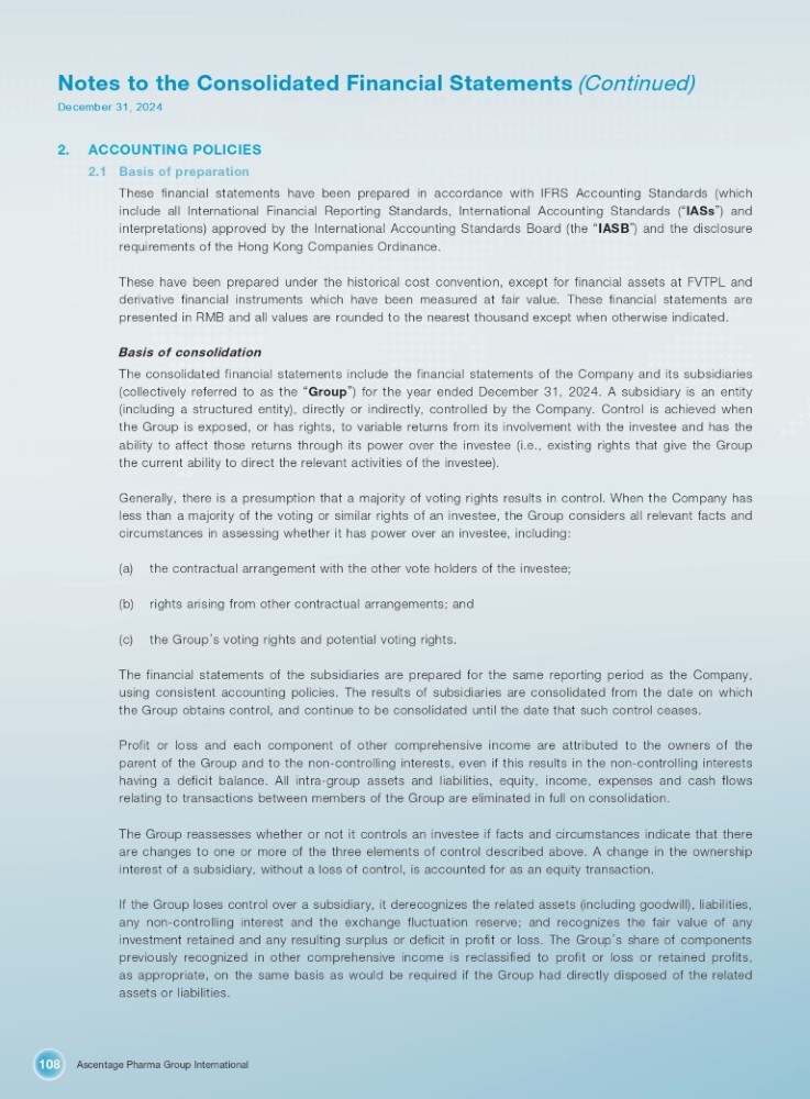 Ascentage Pharma Group International 108 Notes to the Consolidated Financial Statements (Continued) December 31, 2024 2. ACCOUNTING POLICIES 1. Basis of preparation These financial statements have been prepared in accordance with IFRS Accounting Standards (which include all International Financial Reporting Standards, International Accounting Standards ( “ IASs ” ) and interpretations) approved by the International Accounting Standards Board (the “ IASB ” ) and the disclosure requirements of the Hong Kong Companies Ordinance . These have been prepared under the historical cost convention, except for financial assets at FVTPL and derivative financial instruments which have been measured at fair value . These financial statements are presented in RMB and all values are rounded to the nearest thousand except when otherwise indicated . Basis of consolidation The consolidated financial statements include the financial statements of the Company and its subsidiaries (collectively referred to as the “ Group ” ) for the year ended December 31 , 2024 . A subsidiary is an entity (including a structured entity), directly or indirectly, controlled by the Company . Control is achieved when the Group is exposed, or has rights, to variable returns from its involvement with the investee and has the ability to affect those returns through its power over the investee (i . e . , existing rights that give the Group the current ability to direct the relevant activities of the investee) . Generally, there is a presumption that a majority of voting rights results in control . When the Company has less than a majority of the voting or similar rights of an investee, the Group considers all relevant facts and circumstances in assessing whether it has power over an investee, including : (a) the contractual arrangement with the other vote holders of the investee; (b) rights arising from other contractual arrangements; and (c) the Group ’ s voting rights and potential voting rights. The financial statements of the subsidiaries are prepared for the same reporting period as the Company, using consistent accounting policies . The results of subsidiaries are consolidated from the date on which the Group obtains control, and continue to be consolidated until the date that such control ceases . Profit or loss and each component of other comprehensive income are attributed to the owners of the parent of the Group and to the non - controlling interests, even if this results in the non - controlling interests having a deficit balance . All intra - group assets and liabilities, equity, income, expenses and cash flows relating to transactions between members of the Group are eliminated in full on consolidation . The Group reassesses whether or not it controls an investee if facts and circumstances indicate that there are changes to one or more of the three elements of control described above . A change in the ownership interest of a subsidiary, without a loss of control, is accounted for as an equity transaction . If the Group loses control over a subsidiary, it derecognizes the related assets (including goodwill), liabilities, any non - controlling interest and the exchange fluctuation reserve ; and recognizes the fair value of any investment retained and any resulting surplus or deficit in profit or loss . The Group ’ s share of components previously recognized in other comprehensive income is reclassified to profit or loss or retained profits, as appropriate, on the same basis as would be required if the Group had directly disposed of the related assets or liabilities .