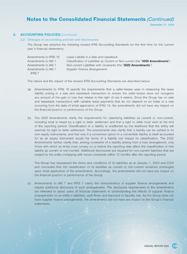 ANNUAL REPORT 2024 109 Notes to the Consolidated Financial Statements (Continued) December 31, 2024 2. ACCOUNTING POLICIES (Continued) 2.2 Changes in accounting policies and disclosures The Group has adopted the following revised IFRS Accounting Standards for the first time for the current year ’ s financial statements. Amendments to IFRS 16 Amendments to IAS 1 Amendments to IAS 1 Amendments to IAS 7 IFRS 7 Lease Liability in a Sale and Leaseback Classification of Liabilities as Current or Non - current (the “ 2020 Amendments ” ) Non - current Liabilities with Covenants (the “ 2022 Amendments ” ) Supplier Finance Arrangements The nature and the impact of the revised IFRS Accounting Standards are described below: (a) Amendments to IFRS 16 specify the requirements that a seller - lessee uses in measuring the lease liability arising in a sale and leaseback transaction to ensure the seller - lessee does not recognize any amount of the gain or loss that relates to the right of use it retains . Since the Group has no sale and leaseback transactions with variable lease payments that do not depend on an index or a rate occurring from the date of initial application of IFRS 16 , the amendments did not have any impact on the financial position or performance of the Group . (b) The 2020 Amendments clarify the requirements for classifying liabilities as current or non - current, including what is meant by a right to defer settlement and that a right to defer must exist at the end of the reporting period . Classification of a liability is unaffected by the likelihood that the entity will exercise its right to defer settlement . The amendments also clarify that a liability can be settled in its own equity instruments, and that only if a conversion option in a convertible liability is itself accounted for as an equity instrument would the terms of a liability not impact its classification . The 2022 Amendments further clarify that, among covenants of a liability arising from a loan arrangement, only those with which an entity must comply on or before the reporting date affect the classification of that liability as current or non - current . Additional disclosures are required for non - current liabilities that are subject to the entity complying with future covenants within 12 months after the reporting period . The Group has reassessed the terms and conditions of its liabilities as at January 1 , 2023 and 2024 and concluded that the classification of its liabilities as current or non - current remained unchanged upon initial application of the amendments . Accordingly, the amendments did not have any impact on the financial position or performance of the Group . (c) Amendments to IAS 7 and IFRS 7 clarify the characteristics of supplier finance arrangements and require additional disclosure of such arrangements . The disclosure requirements in the amendments are intended to assist users of financial statements in understanding the effects of supplier finance arrangements on an entity ’ s liabilities, cash flows and exposure to liquidity risk . As the Group does not have supplier finance arrangements, the amendments did not have any impact on the Group ’ s financial statements .