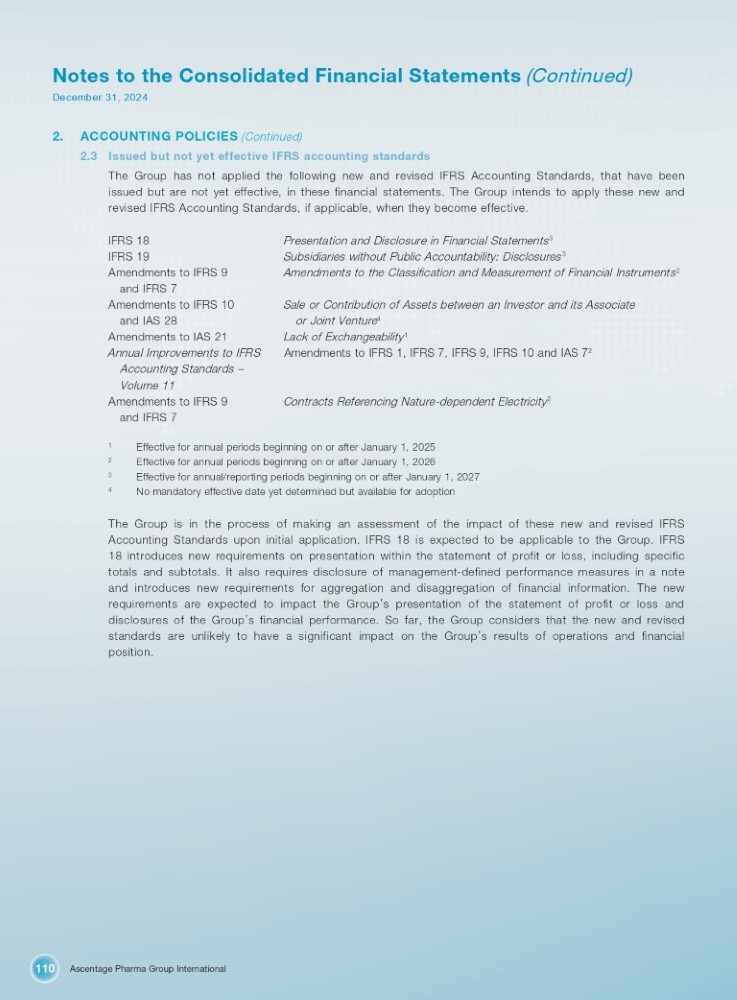 Ascentage Pharma Group International 110 Notes to the Consolidated Financial Statements (Continued) December 31, 2024 2. ACCOUNTING POLICIES (Continued) 2.3 Issued but not yet effective IFRS accounting standards The Group has not applied the following new and revised IFRS Accounting Standards, that have been issued but are not yet effective, in these financial statements . The Group intends to apply these new and revised IFRS Accounting Standards, if applicable, when they become effective . Presentation and Disclosure in Financial Statements 3 Subsidiaries without Public Accountability: Disclosures 3 Amendments to the Classification and Measurement of Financial Instruments 2 Sale or Contribution of Assets between an Investor and its Associate or Joint Venture 4 Lack of Exchangeability 1 Amendments to IFRS 1, IFRS 7, IFRS 9, IFRS 10 and IAS 7 2 IFRS 18 IFRS 19 Amendments to IFRS 9 and IFRS 7 Amendments to IFRS 10 and IAS 28 Amendments to IAS 21 Annual Improvements to IFRS Accounting Standards – Volume 11 Amendments to IFRS 9 and IFRS 7 Contracts Referencing Nature - dependent Electricity 2 1 2 3 4 Effective for annual periods beginning on or after January 1, 2025 Effective for annual periods beginning on or after January 1, 2026 Effective for annual/reporting periods beginning on or after January 1, 2027 No mandatory effective date yet determined but available for adoption The Group is in the process of making an assessment of the impact of these new and revised IFRS Accounting Standards upon initial application . IFRS 18 is expected to be applicable to the Group . IFRS 18 introduces new requirements on presentation within the statement of profit or loss, including specific totals and subtotals . It also requires disclosure of management - defined performance measures in a note and introduces new requirements for aggregation and disaggregation of financial information . The new requirements are expected to impact the Group ’ s presentation of the statement of profit or loss and disclosures of the Group ’ s financial performance . So far, the Group considers that the new and revised standards are unlikely to have a significant impact on the Group ’ s results of operations and financial position .