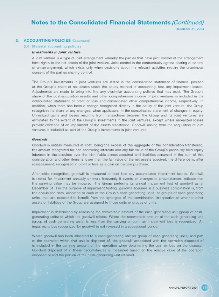 ANNUAL REPORT 2024 111 Notes to the Consolidated Financial Statements (Continued) December 31, 2024 2. ACCOUNTING POLICIES (Continued) 2.4 Material accounting policies Investments in joint venture A joint venture is a type of joint arrangement whereby the parties that have joint control of the arrangement have rights to the net assets of the joint venture . Joint control is the contractually agreed sharing of control of an arrangement, which exists only when decisions about the relevant activities require the unanimous consent of the parties sharing control . The Group ’ s investments in joint ventures are stated in the consolidated statement of financial position at the Group ’ s share of net assets under the equity method of accounting, less any impairment losses . Adjustments are made to bring into line any dissimilar accounting policies that may exist . The Group ’ s share of the post - acquisition results and other comprehensive income of joint ventures is included in the consolidated statement of profit or loss and consolidated other comprehensive income, respectively . In addition, when there has been a change recognized directly in the equity of the joint venture, the Group recognizes its share of any changes, when applicable, in the consolidated statement of changes in equity . Unrealized gains and losses resulting from transactions between the Group and its joint ventures are eliminated to the extent of the Group ’ s investments in the joint ventures, except where unrealized losses provide evidence of an impairment of the assets transferred . Goodwill arising from the acquisition of joint ventures is included as part of the Group ’ s investments in joint ventures . Goodwill Goodwill is initially measured at cost, being the excess of the aggregate of the consideration transferred, the amount recognized for non - controlling interests and any fair value of the Group ’ s previously held equity interests in the acquiree over the identifiable assets acquired and liabilities assumed . If the sum of this consideration and other items is lower than the fair value of the net assets acquired, the difference is, after reassessment, recognized in profit or loss as a gain on bargain purchase . After initial recognition, goodwill is measured at cost less any accumulated impairment losses . Goodwill is tested for impairment annually or more frequently if events or changes in circumstances indicate that the carrying value may be impaired . The Group performs its annual impairment test of goodwill as at December 31 . For the purpose of impairment testing, goodwill acquired in a business combination is, from the acquisition date, allocated to each of the Group ’ s cash - generating units, or groups of cash - generating units, that are expected to benefit from the synergies of the combination, irrespective of whether other assets or liabilities of the Group are assigned to those units or groups of units . Impairment is determined by assessing the recoverable amount of the cash - generating unit (group of cash - generating units) to which the goodwill relates . Where the recoverable amount of the cash - generating unit (group of cash - generating units) is less than the carrying amount, an impairment loss is recognized . An impairment loss recognized for goodwill is not reversed in a subsequent period . Where goodwill has been allocated to a cash - generating unit (or group of cash - generating units) and part of the operation within that unit is disposed of, the goodwill associated with the operation disposed of is included in the carrying amount of the operation when determining the gain or loss on the disposal . Goodwill disposed of in these circumstances is measured based on the relative value of the operation disposed of and the portion of the cash - generating unit retained .