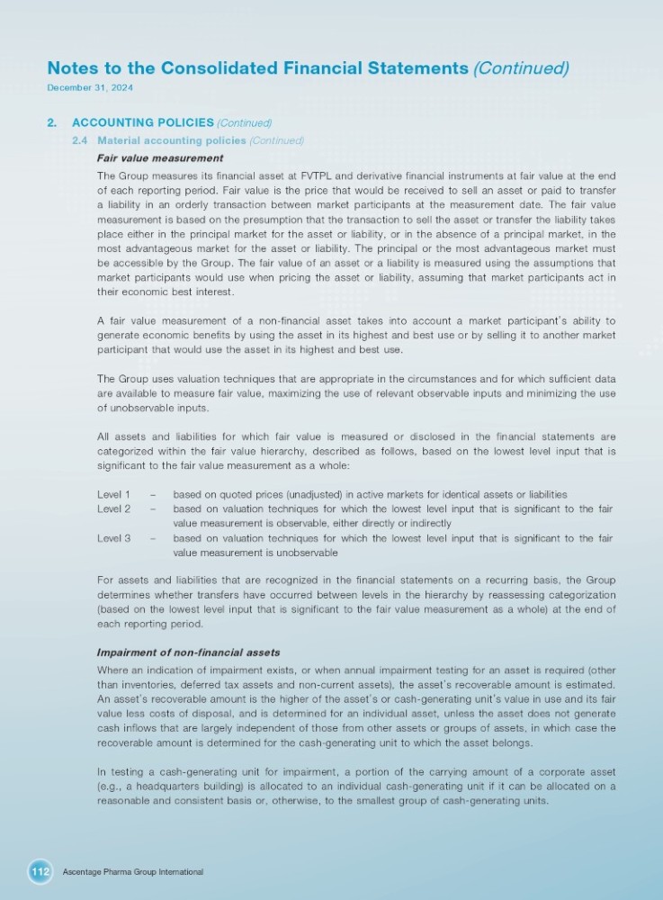 Ascentage Pharma Group International 112 Notes to the Consolidated Financial Statements (Continued) December 31, 2024 2. ACCOUNTING POLICIES (Continued) 2.4 Material accounting policies (Continued) Fair value measurement The Group measures its financial asset at FVTPL and derivative financial instruments at fair value at the end of each reporting period . Fair value is the price that would be received to sell an asset or paid to transfer a liability in an orderly transaction between market participants at the measurement date . The fair value measurement is based on the presumption that the transaction to sell the asset or transfer the liability takes place either in the principal market for the asset or liability, or in the absence of a principal market, in the most advantageous market for the asset or liability . The principal or the most advantageous market must be accessible by the Group . The fair value of an asset or a liability is measured using the assumptions that market participants would use when pricing the asset or liability, assuming that market participants act in their economic best interest . A fair value measurement of a non - financial asset takes into account a market participant ’ s ability to generate economic benefits by using the asset in its highest and best use or by selling it to another market participant that would use the asset in its highest and best use . The Group uses valuation techniques that are appropriate in the circumstances and for which sufficient data are available to measure fair value, maximizing the use of relevant observable inputs and minimizing the use of unobservable inputs . All assets and liabilities for which fair value is measured or disclosed in the financial statements are categorized within the fair value hierarchy, described as follows, based on the lowest level input that is significant to the fair value measurement as a whole : Level 1 Level 2 Level 3 – based on quoted prices (unadjusted) in active markets for identical assets or liabilities – based on valuation techniques for which the lowest level input that is significant to the fair value measurement is observable, either directly or indirectly – based on valuation techniques for which the lowest level input that is significant to the fair value measurement is unobservable For assets and liabilities that are recognized in the financial statements on a recurring basis, the Group determines whether transfers have occurred between levels in the hierarchy by reassessing categorization (based on the lowest level input that is significant to the fair value measurement as a whole) at the end of each reporting period . Impairment of non - financial assets Where an indication of impairment exists, or when annual impairment testing for an asset is required (other than inventories, deferred tax assets and non - current assets), the asset ’ s recoverable amount is estimated . An asset ’ s recoverable amount is the higher of the asset ’ s or cash - generating unit ’ s value in use and its fair value less costs of disposal, and is determined for an individual asset, unless the asset does not generate cash inflows that are largely independent of those from other assets or groups of assets, in which case the recoverable amount is determined for the cash - generating unit to which the asset belongs . In testing a cash - generating unit for impairment, a portion of the carrying amount of a corporate asset (e . g . , a headquarters building) is allocated to an individual cash - generating unit if it can be allocated on a reasonable and consistent basis or, otherwise, to the smallest group of cash - generating units .