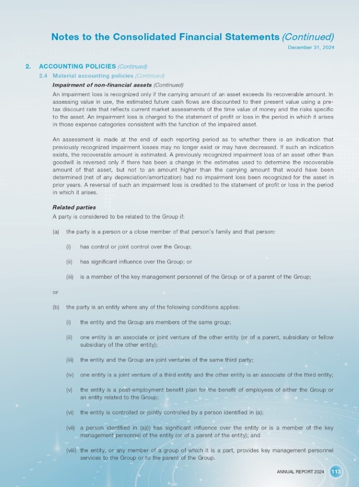 ANNUAL REPORT 2024 113 Notes to the Consolidated Financial Statements (Continued) December 31, 2024 2. ACCOUNTING POLICIES (Continued) 4. Material accounting policies (Continued) Impairment of non - financial assets (Continued) An impairment loss is recognized only if the carrying amount of an asset exceeds its recoverable amount . In assessing value in use, the estimated future cash flows are discounted to their present value using a pre - tax discount rate that reflects current market assessments of the time value of money and the risks specific to the asset . An impairment loss is charged to the statement of profit or loss in the period in which it arises in those expense categories consistent with the function of the impaired asset . An assessment is made at the end of each reporting period as to whether there is an indication that previously recognized impairment losses may no longer exist or may have decreased . If such an indication exists, the recoverable amount is estimated . A previously recognized impairment loss of an asset other than goodwill is reversed only if there has been a change in the estimates used to determine the recoverable amount of that asset, but not to an amount higher than the carrying amount that would have been determined (net of any depreciation/amortization) had no impairment loss been recognized for the asset in prior years . A reversal of such an impairment loss is credited to the statement of profit or loss in the period in which it arises . Related parties A party is considered to be related to the Group if: (a) the party is a person or a close member of that person ’ s family and that person: (i) has control or joint control over the Group; (ii) has significant influence over the Group; or (iii) is a member of the key management personnel of the Group or of a parent of the Group; or (b) the party is an entity where any of the following conditions applies: (i) the entity and the Group are members of the same group; (ii) one entity is an associate or joint venture of the other entity (or of a parent, subsidiary or fellow subsidiary of the other entity); (iii) the entity and the Group are joint ventures of the same third party; (iv) one entity is a joint venture of a third entity and the other entity is an associate of the third entity; (v) the entity is a post - employment benefit plan for the benefit of employees of either the Group or an entity related to the Group; (vi) the entity is controlled or jointly controlled by a person identified in (a); (vii) a person identified in (a)(i) has significant influence over the entity or is a member of the key management personnel of the entity (or of a parent of the entity); and (viii) the entity, or any member of a group of which it is a part, provides key management personnel services to the Group or to the parent of the Group.