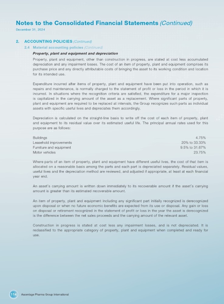 Ascentage Pharma Group International 114 Notes to the Consolidated Financial Statements (Continued) December 31, 2024 2. ACCOUNTING POLICIES (Continued) 2.4 Material accounting policies (Continued) Property, plant and equipment and depreciation Property, plant and equipment, other than construction in progress, are stated at cost less accumulated depreciation and any impairment losses . The cost of an item of property, plant and equipment comprises its purchase price and any directly attributable costs of bringing the asset to its working condition and location for its intended use . Expenditure incurred after items of property, plant and equipment have been put into operation, such as repairs and maintenance, is normally charged to the statement of profit or loss in the period in which it is incurred . In situations where the recognition criteria are satisfied, the expenditure for a major inspection is capitalized in the carrying amount of the asset as a replacement . Where significant parts of property, plant and equipment are required to be replaced at intervals, the Group recognizes such parts as individual assets with specific useful lives and depreciates them accordingly . Depreciation is calculated on the straight - line basis to write off the cost of each item of property, plant and equipment to its residual value over its estimated useful life . The principal annual rates used for this purpose are as follows : Buildings Leasehold improvements Furniture and equipment Motor vehicles 4.75% 20% to 33.33% 9.5% to 31.67% 23.75% Where parts of an item of property, plant and equipment have different useful lives, the cost of that item is allocated on a reasonable basis among the parts and each part is depreciated separately . Residual values, useful lives and the depreciation method are reviewed, and adjusted if appropriate, at least at each financial year end . An asset ’ s carrying amount is written down immediately to its recoverable amount if the asset ’ s carrying amount is greater than its estimated recoverable amount . An item of property, plant and equipment including any significant part initially recognized is derecognized upon disposal or when no future economic benefits are expected from its use or disposal . Any gain or loss on disposal or retirement recognized in the statement of profit or loss in the year the asset is derecognized is the difference between the net sales proceeds and the carrying amount of the relevant asset . Construction in progress is stated at cost less any impairment losses, and is not depreciated . It is reclassified to the appropriate category of property, plant and equipment when completed and ready for use .