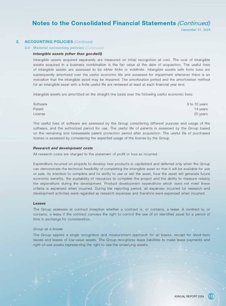 ANNUAL REPORT 2024 115 Notes to the Consolidated Financial Statements (Continued) December 31, 2024 2. ACCOUNTING POLICIES (Continued) 2.4 Material accounting policies (Continued) Intangible assets (other than goodwill) Intangible assets acquired separately are measured on initial recognition at cost . The cost of intangible assets acquired in a business combination is the fair value at the date of acquisition . The useful lives of intangible assets are assessed to be either finite or indefinite . Intangible assets with finite lives are subsequently amortized over the useful economic life and assessed for impairment whenever there is an indication that the intangible asset may be impaired . The amortization period and the amortization method for an intangible asset with a finite useful life are reviewed at least at each financial year end . Intangible assets are amortized on the straight - line basis over the following useful economic lives : Software Patent License 3 to 10 years 14 years 20 years The useful lives of software are assessed by the Group considering different purpose and usage of the software, and the authorized period for use . The useful life of patents is assessed by the Group based on the remaining and foreseeable patent protection period after acquisition . The useful life of purchased license is assessed by considering the expected usage of the license by the Group . Research and development costs All research costs are charged to the statement of profit or loss as incurred . Expenditure incurred on projects to develop new products is capitalized and deferred only when the Group can demonstrate the technical feasibility of completing the intangible asset so that it will be available for use or sale, its intention to complete and its ability to use or sell the asset, how the asset will generate future economic benefits, the availability of resources to complete the project and the ability to measure reliably the expenditure during the development . Product development expenditure which does not meet these criteria is expensed when incurred . During the reporting period, all expenses incurred for research and development activities were regarded as research expenses and therefore were expensed when incurred . Leases The Group assesses at contract inception whether a contract is, or contains, a lease . A contract is, or contains, a lease if the contract conveys the right to control the use of an identified asset for a period of time in exchange for consideration . Group as a lessee The Group applies a single recognition and measurement approach for all leases, except for short - term leases and leases of low - value assets . The Group recognizes lease liabilities to make lease payments and right - of - use assets representing the right to use the underlying assets .
