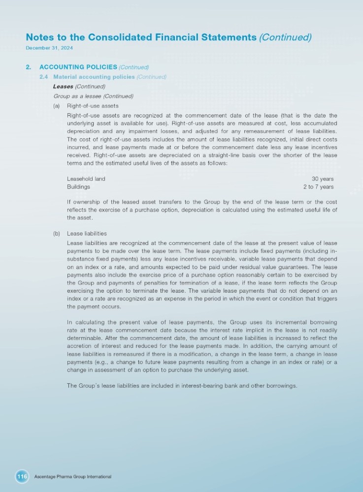 Ascentage Pharma Group International 116 Notes to the Consolidated Financial Statements (Continued) December 31, 2024 2. ACCOUNTING POLICIES (Continued) 4. Material accounting policies (Continued) Leases (Continued) Group as a lessee (Continued) (a) Right - of - use assets Right - of - use assets are recognized at the commencement date of the lease (that is the date the underlying asset is available for use) . Right - of - use assets are measured at cost, less accumulated depreciation and any impairment losses, and adjusted for any remeasurement of lease liabilities . The cost of right - of - use assets includes the amount of lease liabilities recognized, initial direct costs incurred, and lease payments made at or before the commencement date less any lease incentives received . Right - of - use assets are depreciated on a straight - line basis over the shorter of the lease terms and the estimated useful lives of the assets as follows : Leasehold land Buildings 30 years 2 to 7 years If ownership of the leased asset transfers to the Group by the end of the lease term or the cost reflects the exercise of a purchase option, depreciation is calculated using the estimated useful life of the asset . (b) Lease liabilities Lease liabilities are recognized at the commencement date of the lease at the present value of lease payments to be made over the lease term . The lease payments include fixed payments (including in - substance fixed payments) less any lease incentives receivable, variable lease payments that depend on an index or a rate, and amounts expected to be paid under residual value guarantees . The lease payments also include the exercise price of a purchase option reasonably certain to be exercised by the Group and payments of penalties for termination of a lease, if the lease term reflects the Group exercising the option to terminate the lease . The variable lease payments that do not depend on an index or a rate are recognized as an expense in the period in which the event or condition that triggers the payment occurs . In calculating the present value of lease payments, the Group uses its incremental borrowing rate at the lease commencement date because the interest rate implicit in the lease is not readily determinable . After the commencement date, the amount of lease liabilities is increased to reflect the accretion of interest and reduced for the lease payments made . In addition, the carrying amount of lease liabilities is remeasured if there is a modification, a change in the lease term, a change in lease payments (e . g . , a change to future lease payments resulting from a change in an index or rate) or a change in assessment of an option to purchase the underlying asset . The Group ’ s lease liabilities are included in interest - bearing bank and other borrowings .