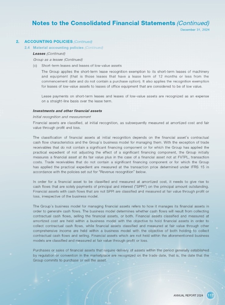 ANNUAL REPORT 2024 117 Notes to the Consolidated Financial Statements (Continued) December 31, 2024 2. ACCOUNTING POLICIES (Continued) 2.4 Material accounting policies (Continued) Leases (Continued) Group as a lessee (Continued) (c) Short - term leases and leases of low - value assets The Group applies the short - term lease recognition exemption to its short - term leases of machinery and equipment (that is those leases that have a lease term of 12 months or less from the commencement date and do not contain a purchase option) . It also applies the recognition exemption for leases of low - value assets to leases of office equipment that are considered to be of low value . Lease payments on short - term leases and leases of low - value assets are recognized as an expense on a straight - line basis over the lease term . Investments and other financial assets Initial recognition and measurement Financial assets are classified, at initial recognition, as subsequently measured at amortized cost and fair value through profit and loss . The classification of financial assets at initial recognition depends on the financial asset ’ s contractual cash flow characteristics and the Group ’ s business model for managing them . With the exception of trade receivables that do not contain a significant financing component or for which the Group has applied the practical expedient of not adjusting the effect of a significant financing component, the Group initially measures a financial asset at its fair value plus in the case of a financial asset not at FVTPL, transaction costs . Trade receivables that do not contain a significant financing component or for which the Group has applied the practical expedient are measured at the transaction price determined under IFRS 15 in accordance with the policies set out for “ Revenue recognition ” below . In order for a financial asset to be classified and measured at amortized cost, it needs to give rise to cash flows that are solely payments of principal and interest ( “ SPPI ” ) on the principal amount outstanding . Financial assets with cash flows that are not SPPI are classified and measured at fair value through profit or loss, irrespective of the business model . The Group ’ s business model for managing financial assets refers to how it manages its financial assets in order to generate cash flows . The business model determines whether cash flows will result from collecting contractual cash flows, selling the financial assets, or both . Financial assets classified and measured at amortized cost are held within a business model with the objective to hold financial assets in order to collect contractual cash flows, while financial assets classified and measured at fair value through other comprehensive income are held within a business model with the objective of both holding to collect contractual cash flows and selling . Financial assets which are not held within the aforementioned business models are classified and measured at fair value through profit or loss . Purchases or sales of financial assets that require delivery of assets within the period generally established by regulation or convention in the marketplace are recognized on the trade date, that is, the date that the Group commits to purchase or sell the asset .