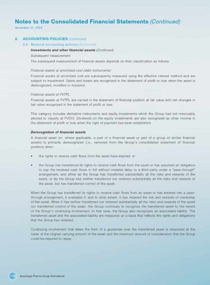 Ascentage Pharma Group International 118 Notes to the Consolidated Financial Statements (Continued) December 31, 2024 2. ACCOUNTING POLICIES (Continued) 4. Material accounting policies (Continued) Investments and other financial assets (Continued) Subsequent measurement The subsequent measurement of financial assets depends on their classification as follows : Financial assets at amortized cost (debt instruments) Financial assets at amortized cost are subsequently measured using the effective interest method and are subject to impairment . Gains and losses are recognized in the statement of profit or loss when the asset is derecognized, modified or impaired . Financial assets at FVTPL Financial assets at FVTPL are carried in the statement of financial position at fair value with net changes in fair value recognized in the statement of profit or loss . This category includes derivative instruments and equity investments which the Group had not irrevocably elected to classify at FVOCI . Dividends on the equity investments are also recognized as other income in the statement of profit or loss when the right of payment has been established . Derecognition of financial assets A financial asset (or, where applicable, a part of a financial asset or part of a group of similar financial assets) is primarily derecognized (i . e . , removed from the Group ’ s consolidated statement of financial position) when : • the rights to receive cash flows from the asset have expired; or • the Group has transferred its rights to receive cash flows from the asset or has assumed an obligation to pay the received cash flows in full without material delay to a third party under a “ pass - through ” arrangement ; and either (a) the Group has transferred substantially all the risks and rewards of the asset, or (b) the Group has neither transferred nor retained substantially all the risks and rewards of the asset, but has transferred control of the asset . When the Group has transferred its rights to receive cash flows from an asset or has entered into a pass - through arrangement, it evaluates if, and to what extent, it has retained the risk and rewards of ownership of the asset . When it has neither transferred nor retained substantially all the risks and rewards of the asset nor transferred control of the asset, the Group continues to recognize the transferred asset to the extent of the Group ’ s continuing involvement . In that case, the Group also recognizes an associated liability . The transferred asset and the associated liability are measured on a basis that reflects the rights and obligations that the Group has retained . Continuing involvement that takes the form of a guarantee over the transferred asset is measured at the lower of the original carrying amount of the asset and the maximum amount of consideration that the Group could be required to repay .