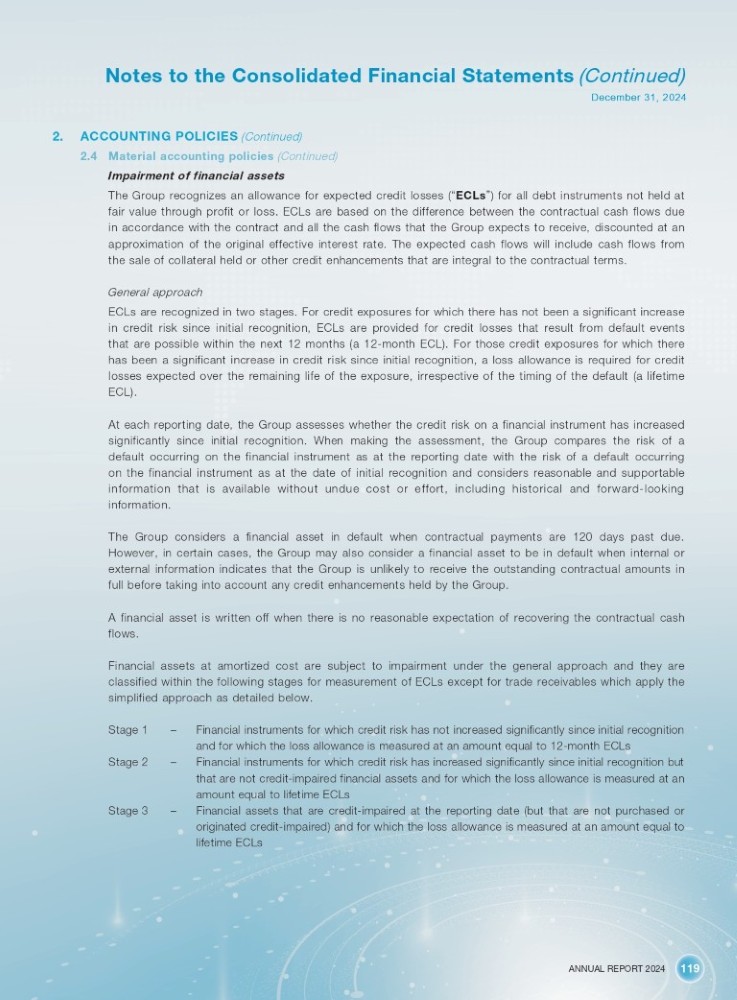 ANNUAL REPORT 2024 119 Notes to the Consolidated Financial Statements (Continued) December 31, 2024 2. ACCOUNTING POLICIES (Continued) 2.4 Material accounting policies (Continued) Impairment of financial assets The Group recognizes an allowance for expected credit losses ( “ ECLs ” ) for all debt instruments not held at fair value through profit or loss . ECLs are based on the difference between the contractual cash flows due in accordance with the contract and all the cash flows that the Group expects to receive, discounted at an approximation of the original effective interest rate . The expected cash flows will include cash flows from the sale of collateral held or other credit enhancements that are integral to the contractual terms . General approach ECLs are recognized in two stages . For credit exposures for which there has not been a significant increase in credit risk since initial recognition, ECLs are provided for credit losses that result from default events that are possible within the next 12 months (a 12 - month ECL) . For those credit exposures for which there has been a significant increase in credit risk since initial recognition, a loss allowance is required for credit losses expected over the remaining life of the exposure, irrespective of the timing of the default (a lifetime ECL) . At each reporting date, the Group assesses whether the credit risk on a financial instrument has increased significantly since initial recognition . When making the assessment, the Group compares the risk of a default occurring on the financial instrument as at the reporting date with the risk of a default occurring on the financial instrument as at the date of initial recognition and considers reasonable and supportable information that is available without undue cost or effort, including historical and forward - looking information . The Group considers a financial asset in default when contractual payments are 120 days past due . However, in certain cases, the Group may also consider a financial asset to be in default when internal or external information indicates that the Group is unlikely to receive the outstanding contractual amounts in full before taking into account any credit enhancements held by the Group . A financial asset is written off when there is no reasonable expectation of recovering the contractual cash flows . Financial assets at amortized cost are subject to impairment under the general approach and they are classified within the following stages for measurement of ECLs except for trade receivables which apply the simplified approach as detailed below . Stage 1 – Stage 2 – Stage 3 Financial instruments for which credit risk has not increased significantly since initial recognition and for which the loss allowance is measured at an amount equal to 12 - month ECLs Financial instruments for which credit risk has increased significantly since initial recognition but that are not credit - impaired financial assets and for which the loss allowance is measured at an amount equal to lifetime ECLs – Financial assets that are credit - impaired at the reporting date (but that are not purchased or originated credit - impaired) and for which the loss allowance is measured at an amount equal to lifetime ECLs