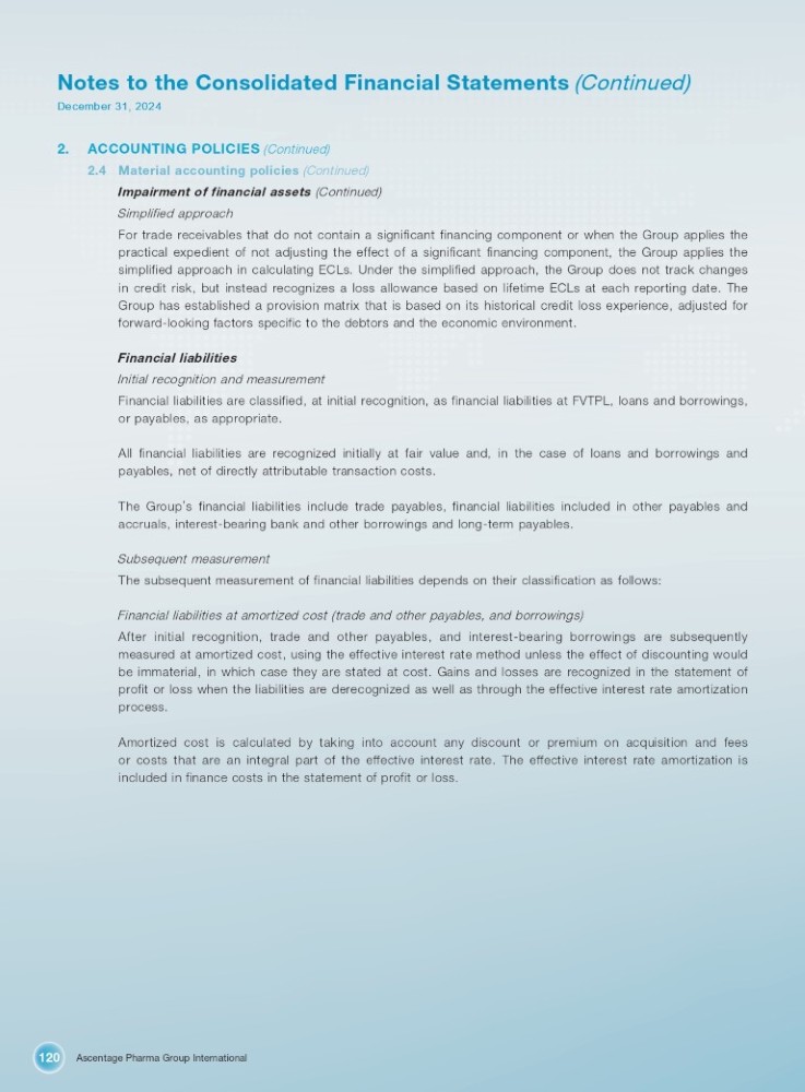 Ascentage Pharma Group International 120 Notes to the Consolidated Financial Statements (Continued) December 31, 2024 2. ACCOUNTING POLICIES (Continued) 2.4 Material accounting policies (Continued) Impairment of financial assets (Continued) Simplified approach For trade receivables that do not contain a significant financing component or when the Group applies the practical expedient of not adjusting the effect of a significant financing component, the Group applies the simplified approach in calculating ECLs . Under the simplified approach, the Group does not track changes in credit risk, but instead recognizes a loss allowance based on lifetime ECLs at each reporting date . The Group has established a provision matrix that is based on its historical credit loss experience, adjusted for forward - looking factors specific to the debtors and the economic environment . Financial liabilities Initial recognition and measurement Financial liabilities are classified, at initial recognition, as financial liabilities at FVTPL, loans and borrowings, or payables, as appropriate . All financial liabilities are recognized initially at fair value and, in the case of loans and borrowings and payables, net of directly attributable transaction costs . The Group ’ s financial liabilities include trade payables, financial liabilities included in other payables and accruals, interest - bearing bank and other borrowings and long - term payables . Subsequent measurement The subsequent measurement of financial liabilities depends on their classification as follows : Financial liabilities at amortized cost (trade and other payables, and borrowings) After initial recognition, trade and other payables, and interest - bearing borrowings are subsequently measured at amortized cost, using the effective interest rate method unless the effect of discounting would be immaterial, in which case they are stated at cost . Gains and losses are recognized in the statement of profit or loss when the liabilities are derecognized as well as through the effective interest rate amortization process . Amortized cost is calculated by taking into account any discount or premium on acquisition and fees or costs that are an integral part of the effective interest rate . The effective interest rate amortization is included in finance costs in the statement of profit or loss .