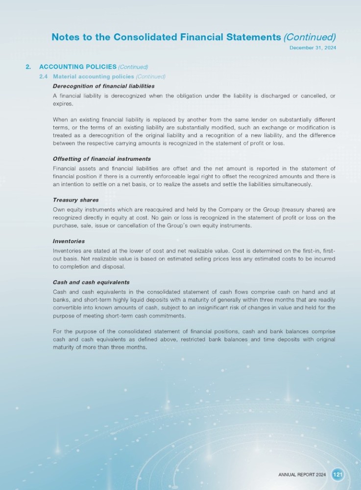 ANNUAL REPORT 2024 121 Notes to the Consolidated Financial Statements (Continued) December 31, 2024 2. ACCOUNTING POLICIES (Continued) 2.4 Material accounting policies (Continued) Derecognition of financial liabilities A financial liability is derecognized when the obligation under the liability is discharged or cancelled, or expires . When an existing financial liability is replaced by another from the same lender on substantially different terms, or the terms of an existing liability are substantially modified, such an exchange or modification is treated as a derecognition of the original liability and a recognition of a new liability, and the difference between the respective carrying amounts is recognized in the statement of profit or loss . Offsetting of financial instruments Financial assets and financial liabilities are offset and the net amount is reported in the statement of financial position if there is a currently enforceable legal right to offset the recognized amounts and there is an intention to settle on a net basis, or to realize the assets and settle the liabilities simultaneously . Treasury shares Own equity instruments which are reacquired and held by the Company or the Group (treasury shares) are recognized directly in equity at cost . No gain or loss is recognized in the statement of profit or loss on the purchase, sale, issue or cancellation of the Group ’ s own equity instruments . Inventories Inventories are stated at the lower of cost and net realizable value . Cost is determined on the first - in, first - out basis . Net realizable value is based on estimated selling prices less any estimated costs to be incurred to completion and disposal . Cash and cash equivalents Cash and cash equivalents in the consolidated statement of cash flows comprise cash on hand and at banks, and short - term highly liquid deposits with a maturity of generally within three months that are readily convertible into known amounts of cash, subject to an insignificant risk of changes in value and held for the purpose of meeting short - term cash commitments . For the purpose of the consolidated statement of financial positions, cash and bank balances comprise cash and cash equivalents as defined above, restricted bank balances and time deposits with original maturity of more than three months .