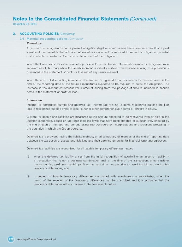 Ascentage Pharma Group International 122 Notes to the Consolidated Financial Statements (Continued) December 31, 2024 2. ACCOUNTING POLICIES (Continued) 4. Material accounting policies (Continued) Provisions A provision is recognized when a present obligation (legal or constructive) has arisen as a result of a past event and it is probable that a future outflow of resources will be required to settle the obligation, provided that a reliable estimate can be made of the amount of the obligation . When the Group expects some or all of a provision to be reimbursed, the reimbursement is recognized as a separate asset, but only when the reimbursement is virtually certain . The expense relating to a provision is presented in the statement of profit or loss net of any reimbursement . When the effect of discounting is material, the amount recognized for a provision is the present value at the end of the reporting date of the future expenditures expected to be required to settle the obligation . The increase in the discounted present value amount arising from the passage of time is included in finance costs in the statement of profit or loss . Income tax Income tax comprises current and deferred tax . Income tax relating to items recognized outside profit or loss is recognized outside profit or loss, either in other comprehensive income or directly in equity . Current tax assets and liabilities are measured at the amount expected to be recovered from or paid to the taxation authorities, based on tax rates (and tax laws) that have been enacted or substantively enacted by the end of each of the reporting period, taking into consideration interpretations and practices prevailing in the countries in which the Group operates . Deferred tax is provided, using the liability method, on all temporary differences at the end of reporting date between the tax bases of assets and liabilities and their carrying amounts for financial reporting purposes . Deferred tax liabilities are recognized for all taxable temporary differences, except : (i) when the deferred tax liability arises from the initial recognition of goodwill or an asset or liability in a transaction that is not a business combination and, at the time of the transaction, affects neither the accounting profit nor taxable profit or loss and does not give rise to equal taxable and deductible temporary differences ; and (ii) in respect of taxable temporary differences associated with investments in subsidiaries, when the timing of the reversal of the temporary differences can be controlled and it is probable that the temporary differences will not reverse in the foreseeable future .