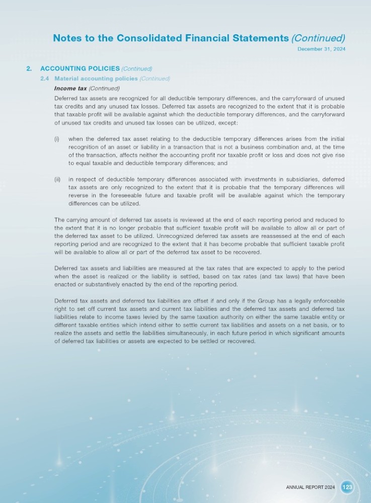 ANNUAL REPORT 2024 123 Notes to the Consolidated Financial Statements (Continued) December 31, 2024 2. ACCOUNTING POLICIES (Continued) 4. Material accounting policies (Continued) Income tax (Continued) Deferred tax assets are recognized for all deductible temporary differences, and the carryforward of unused tax credits and any unused tax losses . Deferred tax assets are recognized to the extent that it is probable that taxable profit will be available against which the deductible temporary differences, and the carryforward of unused tax credits and unused tax losses can be utilized, except : (i) when the deferred tax asset relating to the deductible temporary differences arises from the initial recognition of an asset or liability in a transaction that is not a business combination and, at the time of the transaction, affects neither the accounting profit nor taxable profit or loss and does not give rise to equal taxable and deductible temporary differences ; and (ii) in respect of deductible temporary differences associated with investments in subsidiaries, deferred tax assets are only recognized to the extent that it is probable that the temporary differences will reverse in the foreseeable future and taxable profit will be available against which the temporary differences can be utilized . The carrying amount of deferred tax assets is reviewed at the end of each reporting period and reduced to the extent that it is no longer probable that sufficient taxable profit will be available to allow all or part of the deferred tax asset to be utilized . Unrecognized deferred tax assets are reassessed at the end of each reporting period and are recognized to the extent that it has become probable that sufficient taxable profit will be available to allow all or part of the deferred tax asset to be recovered . Deferred tax assets and liabilities are measured at the tax rates that are expected to apply to the period when the asset is realized or the liability is settled, based on tax rates (and tax laws) that have been enacted or substantively enacted by the end of the reporting period . Deferred tax assets and deferred tax liabilities are offset if and only if the Group has a legally enforceable right to set off current tax assets and current tax liabilities and the deferred tax assets and deferred tax liabilities relate to income taxes levied by the same taxation authority on either the same taxable entity or different taxable entities which intend either to settle current tax liabilities and assets on a net basis, or to realize the assets and settle the liabilities simultaneously, in each future period in which significant amounts of deferred tax liabilities or assets are expected to be settled or recovered .